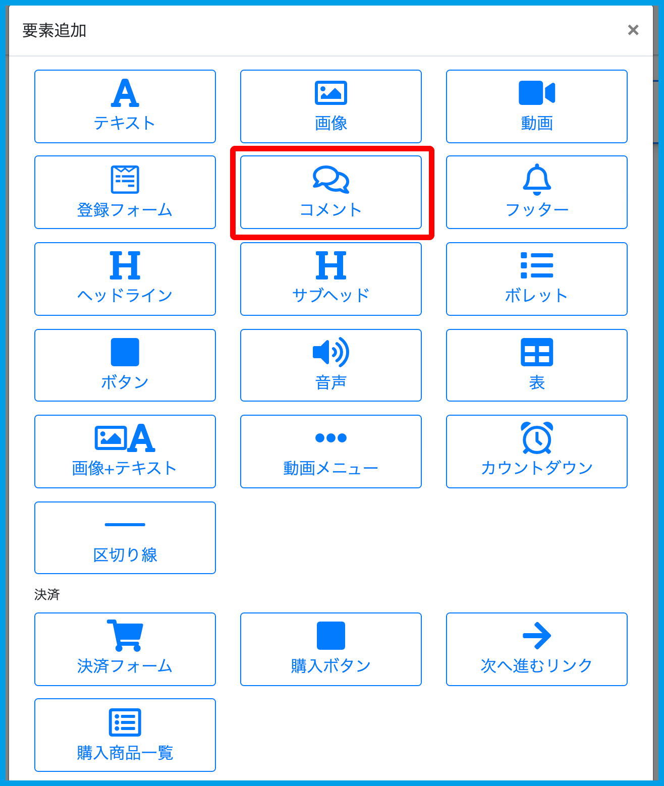 2.ポップアップ表示内にて【コメント】をクリックします。