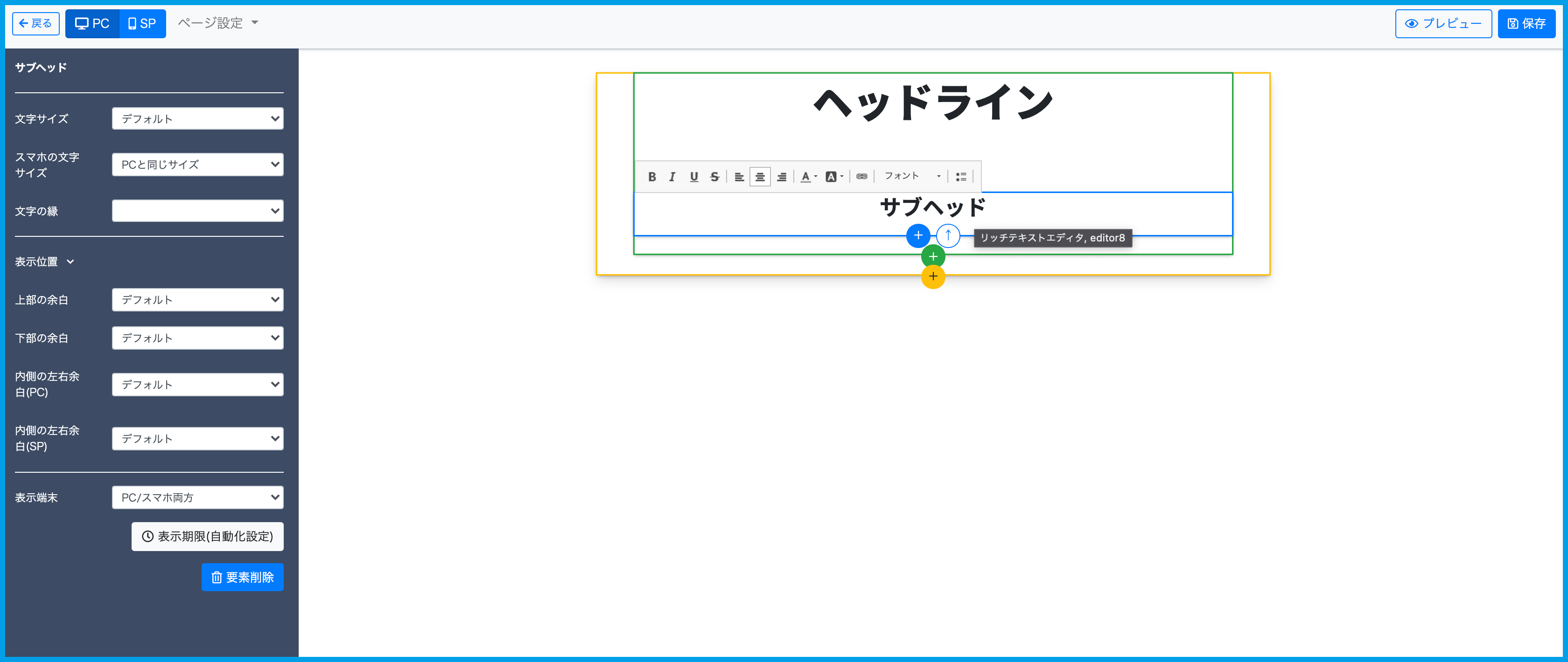 3.ページ編集画面にて「サブヘッド」を追加したい場所の【+】をクリックします。