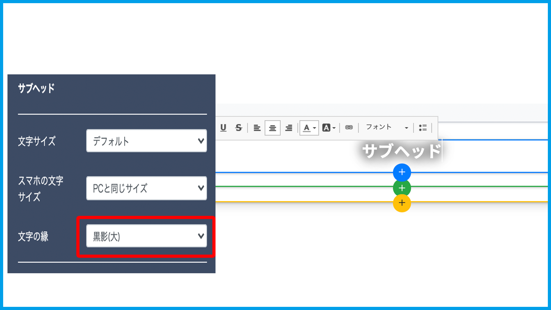 「ヘッドライン」要素と同じく「文字の縁」の影色も設定できます。