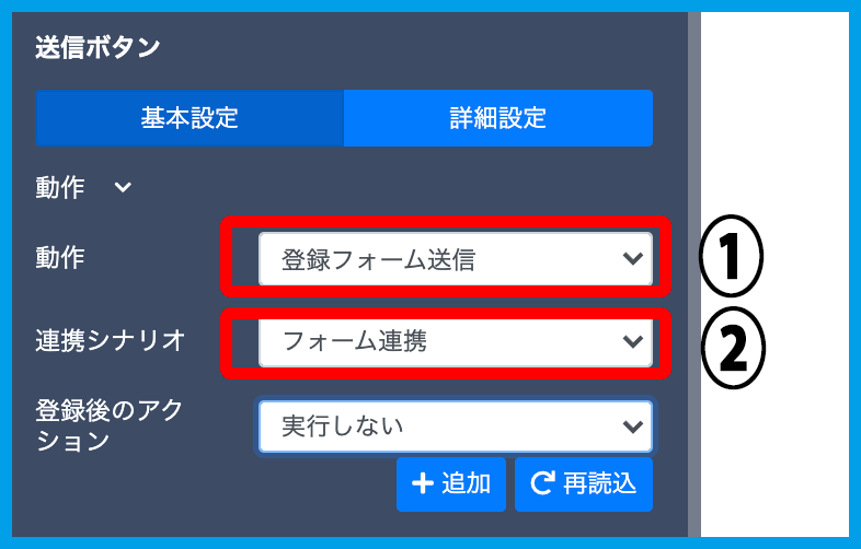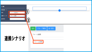 4.動作を「登録フォーム送信」、連携シナリオは手順1と同じシナリオを選択します。