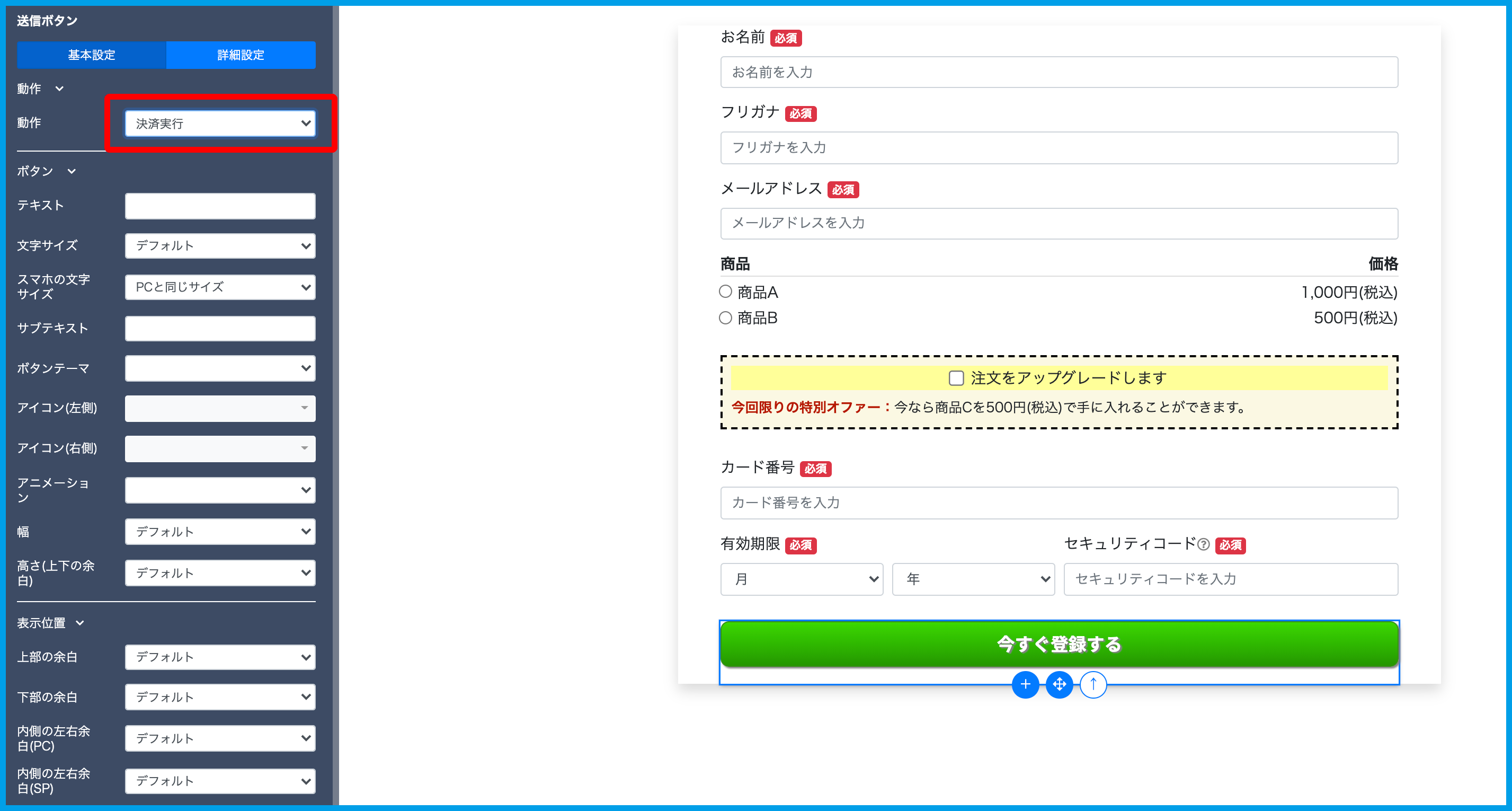 「登録フォーム送信」「決済実行」「ワンクリック決済実行」から選択できます。