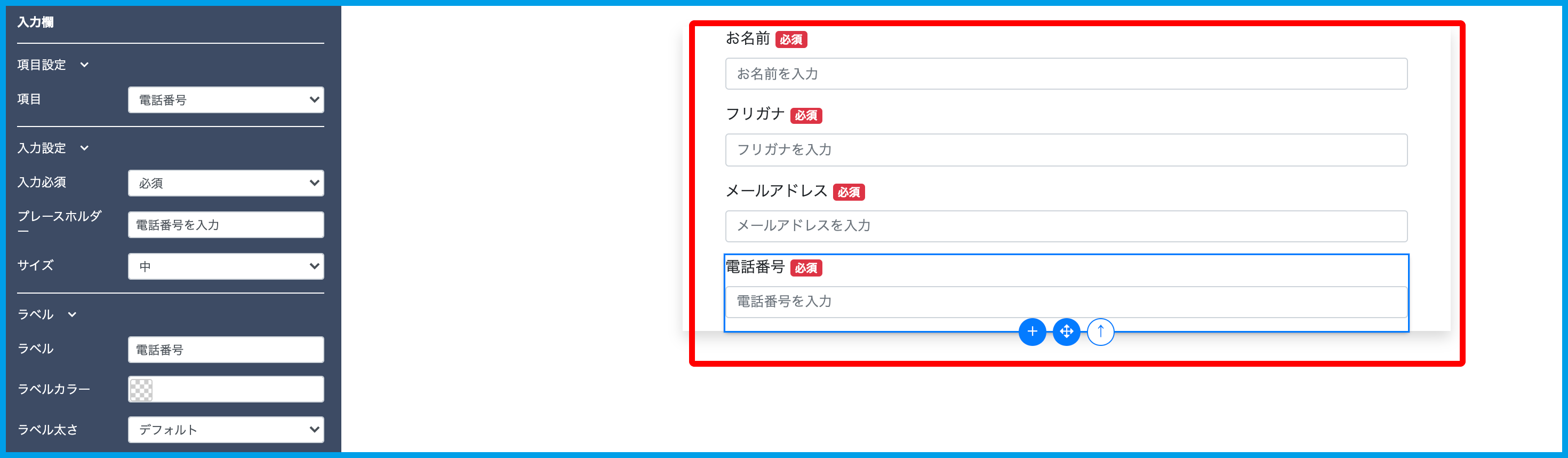 1.「入力欄」要素にて、購入時に入力する情報の項目を追加します。