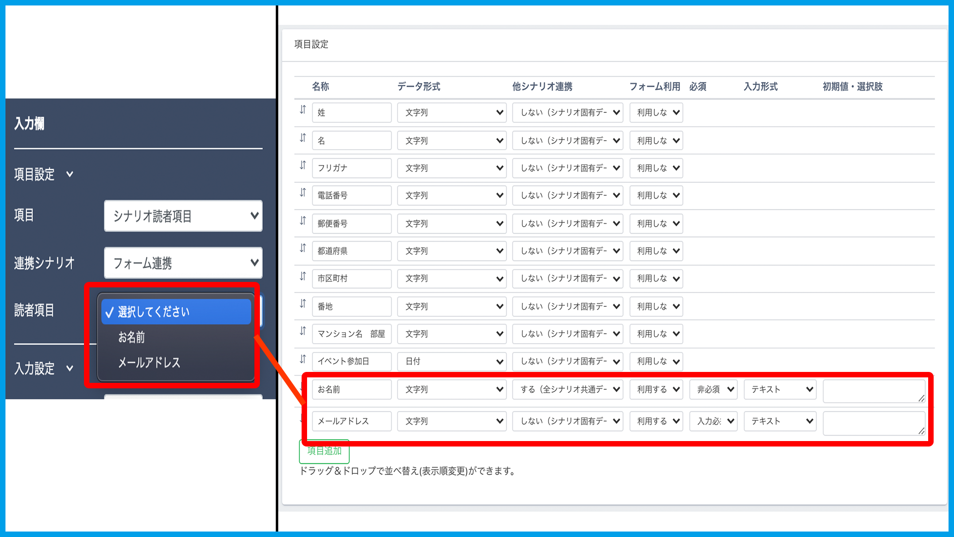 2.読者項目は、シナリオの読者項目設定にて、フォーム利用を「利用する」にしている項目が表示されます。