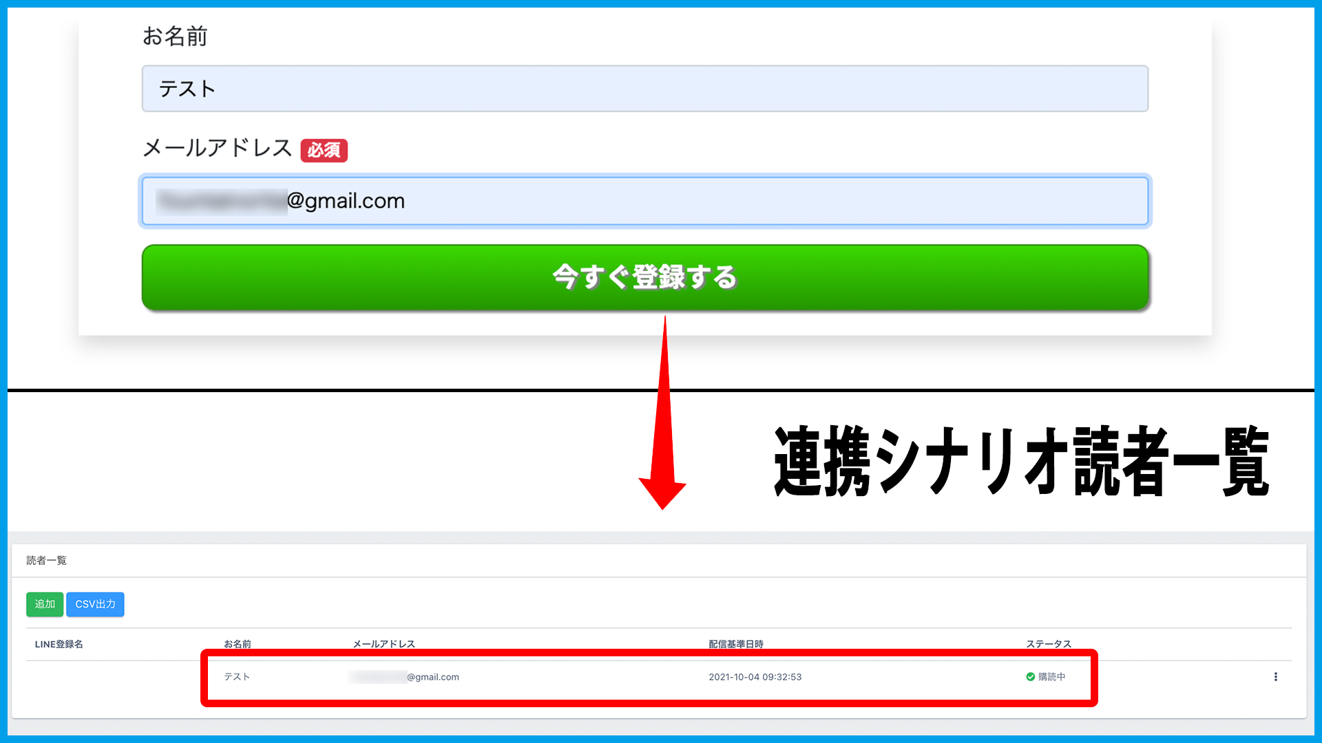 5.設定完了となり、フォームから登録されると連携シナリオに読者が追加されます。