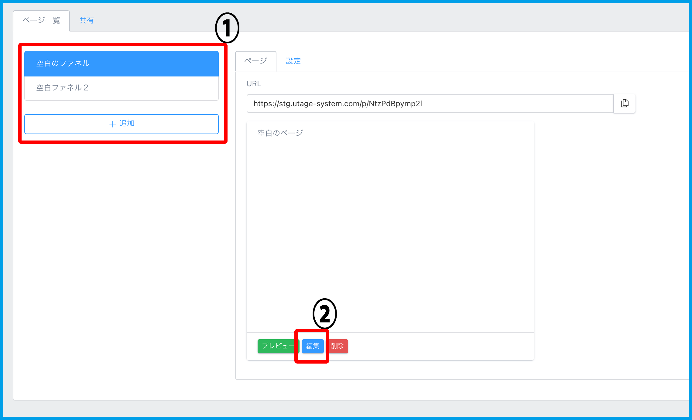 2.「ページ一覧」より要素を追加するページの編集をクリックします。