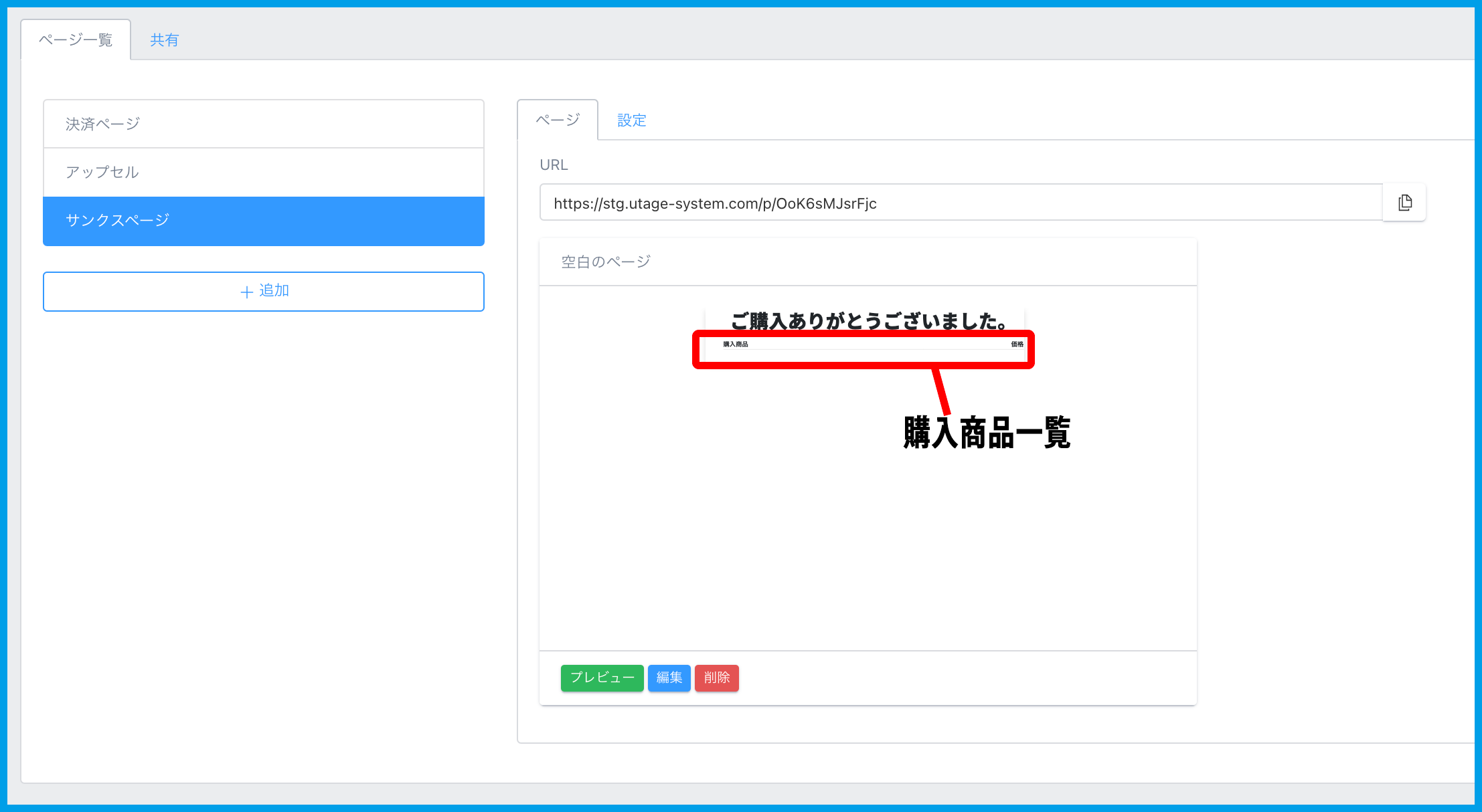 1.決済ページ以降に【購入商品一覧】要素を設定したページを作成します。