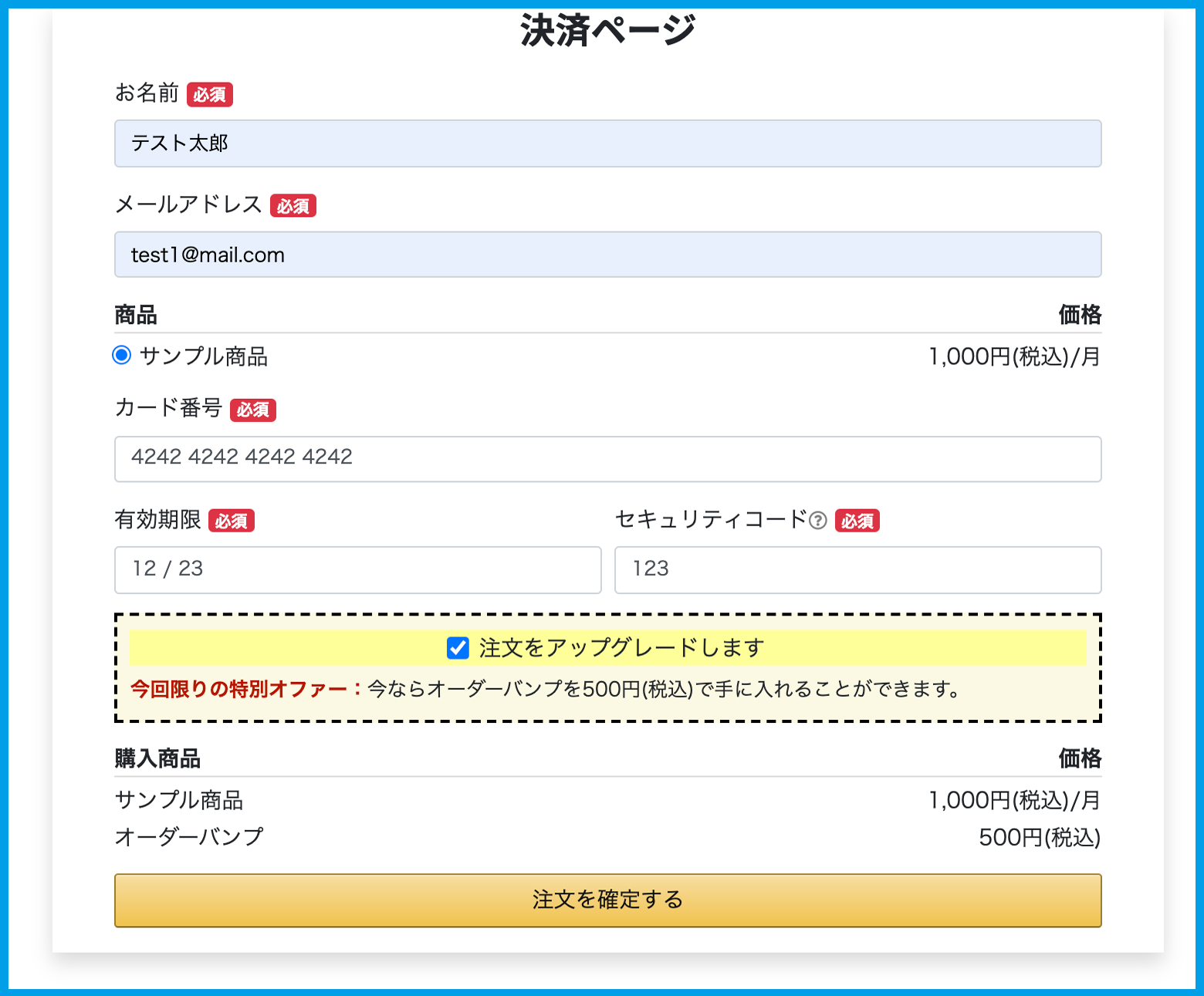 ※画像内のカード情報は、Stripeのテスト用カードを用いたものです。