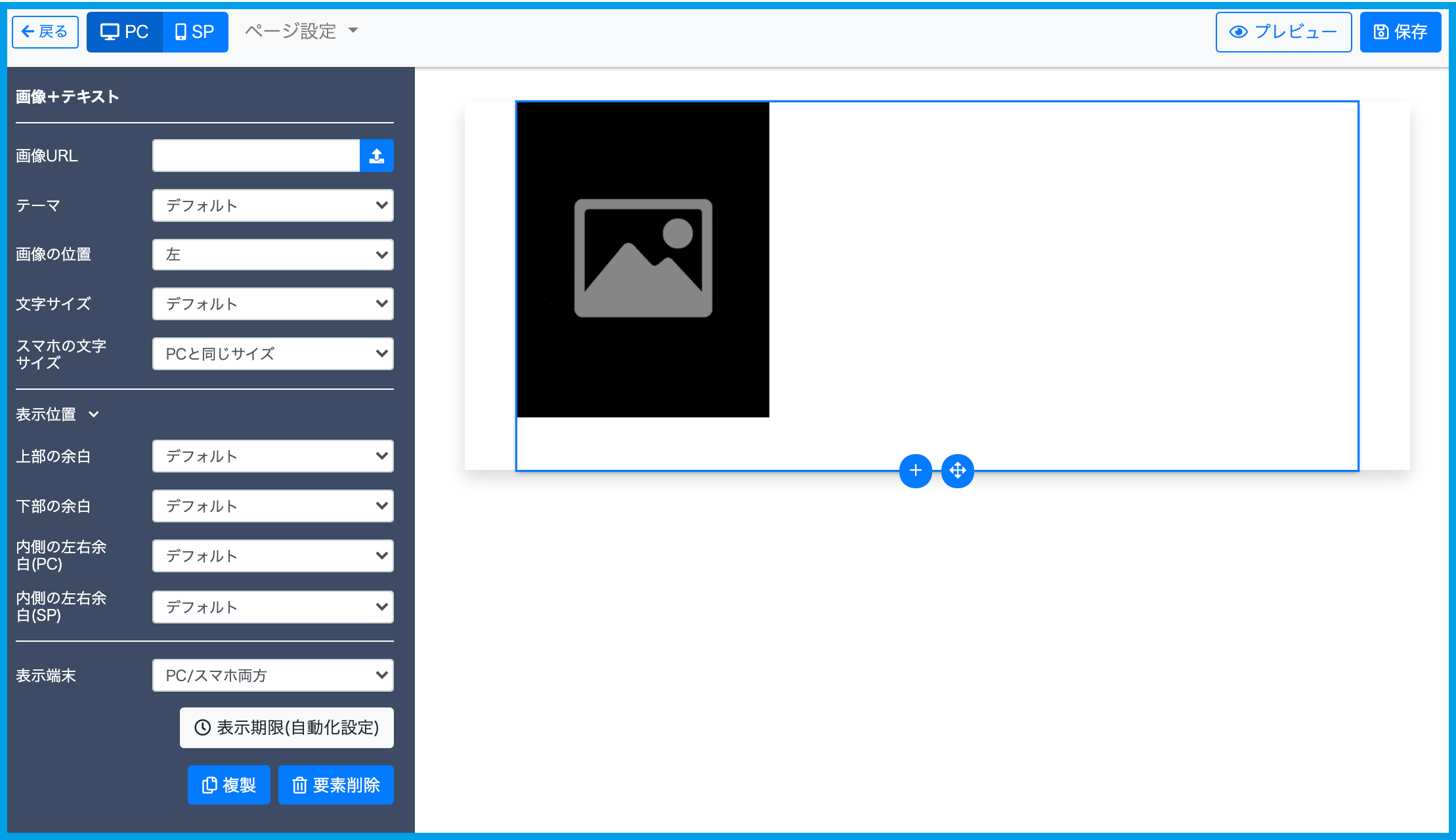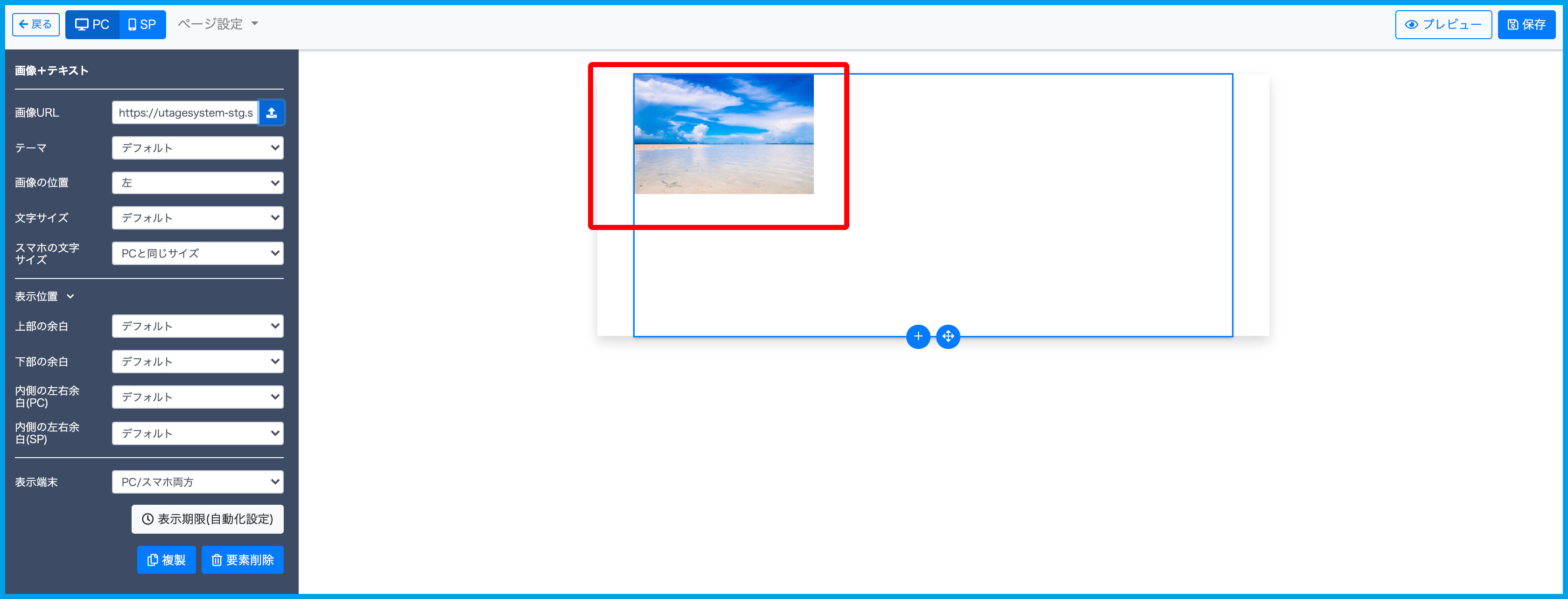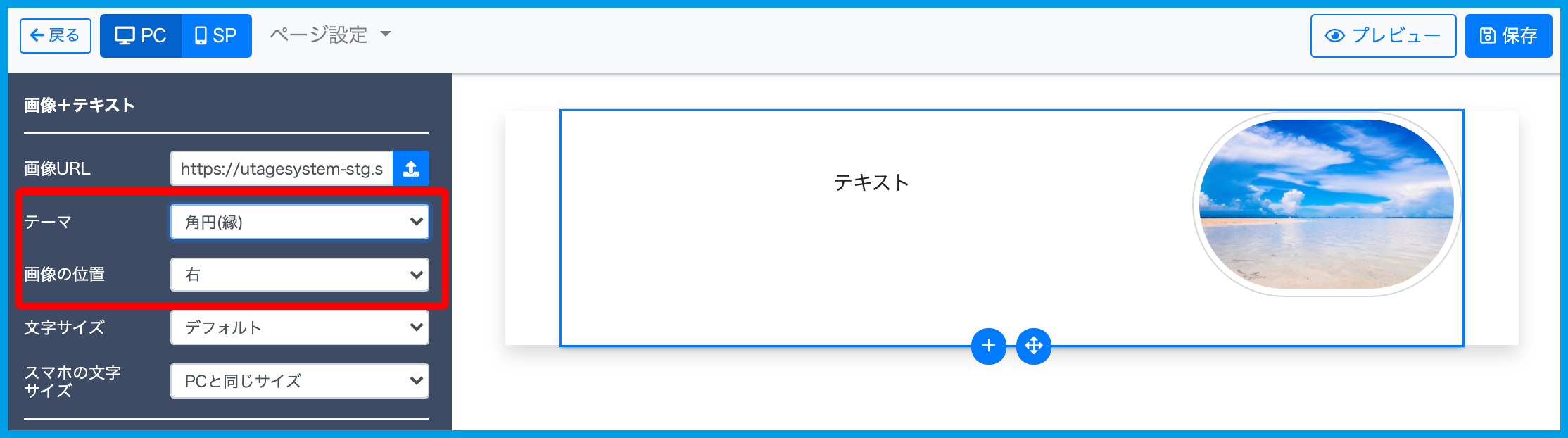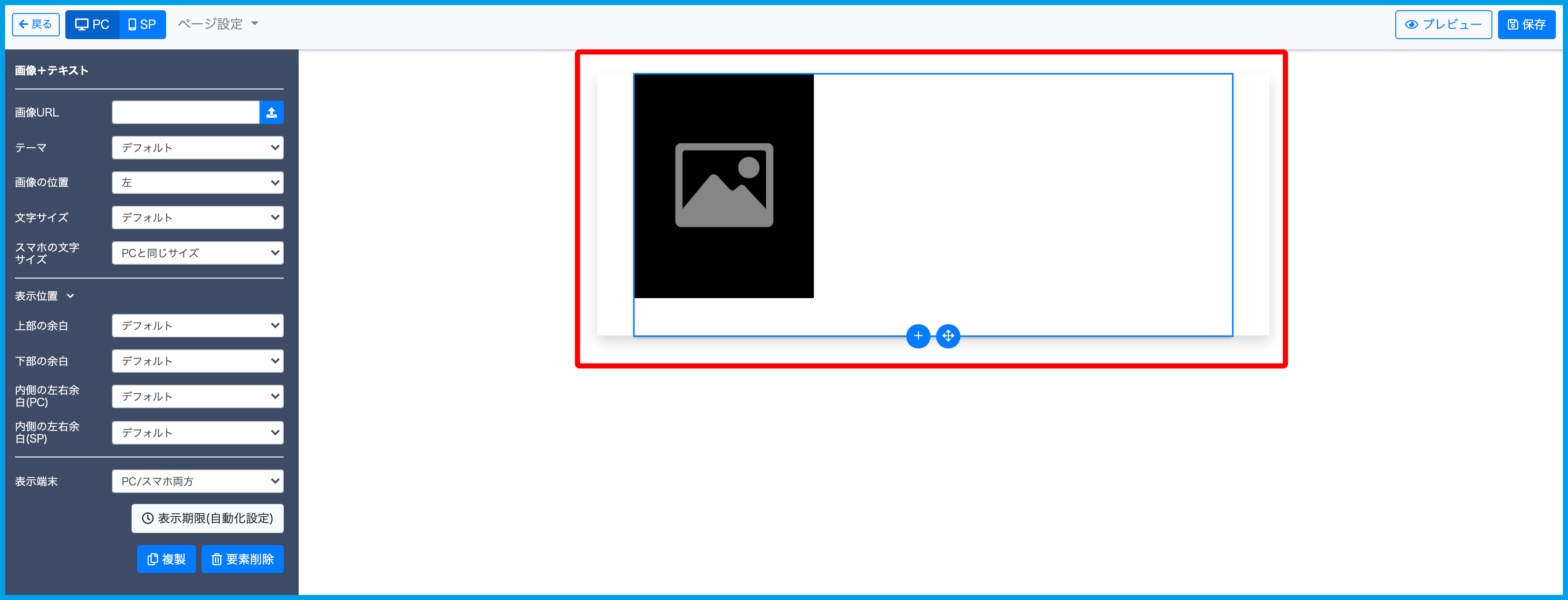 3.ページ編集画面にて「画像+テキスト」を追加したい場所の【+】をクリックします。