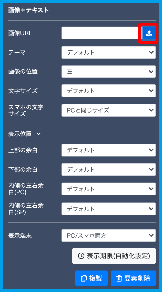 1.「画像URL」のアップロードボタンを押し、アップする画像を選択します。