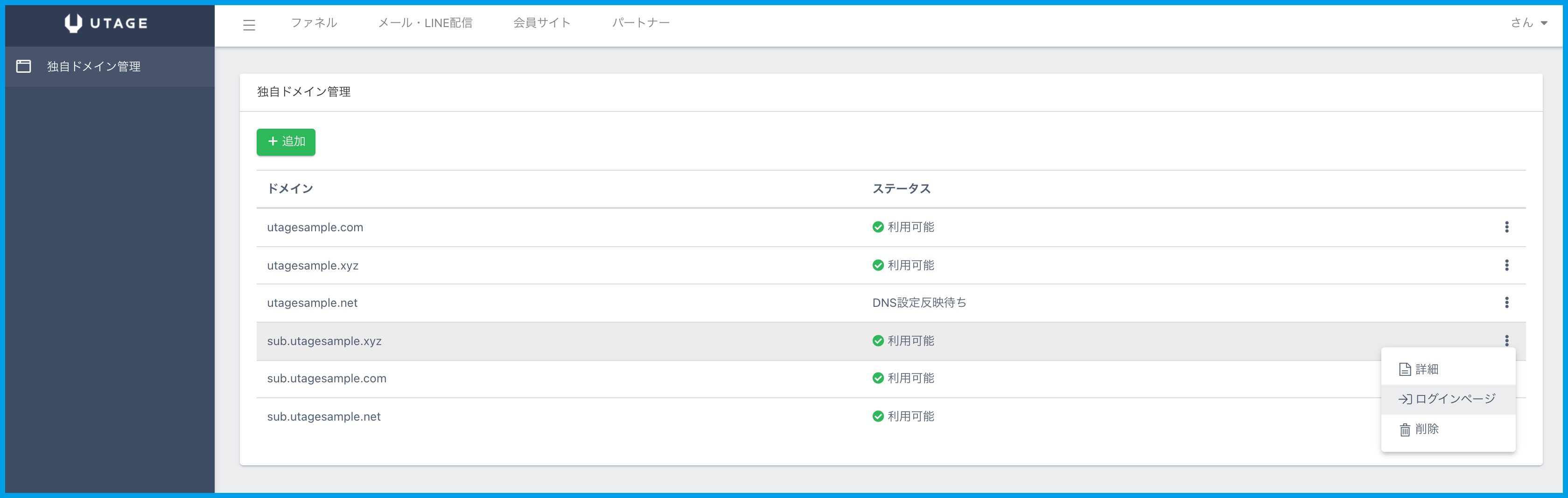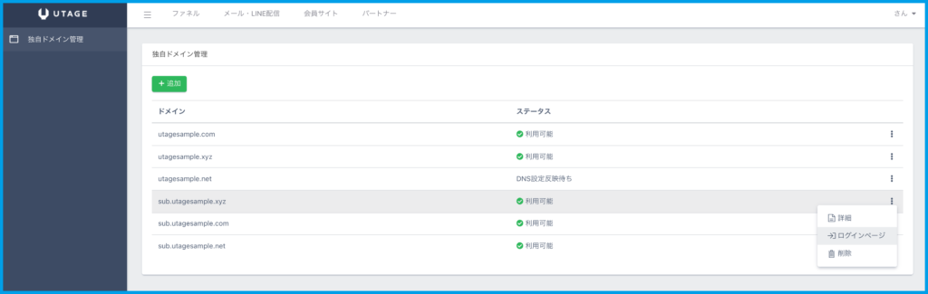 2.利用したい独自ドメインの「⋮」をクリックし、メニューから【ログインページ】を選択します。
