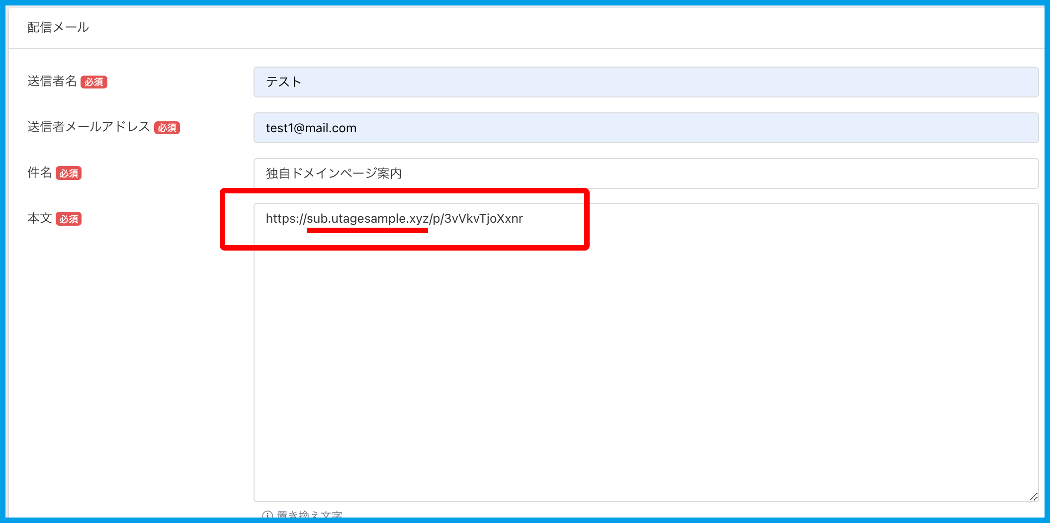 「stg.utage-system.com」を「sub.utagesample.xyz」に書き換えます。