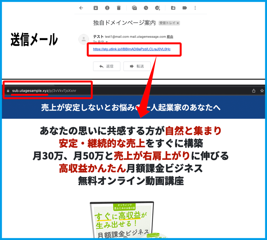 3.リンクをクリックすると「ランディングページ」が独自ドメインを利用した状態で開かれるようになります。