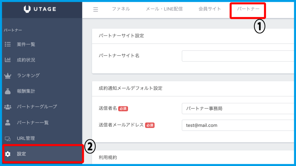 1.上メニュー【パートナー】>左メニュー【設定】をクリックします。