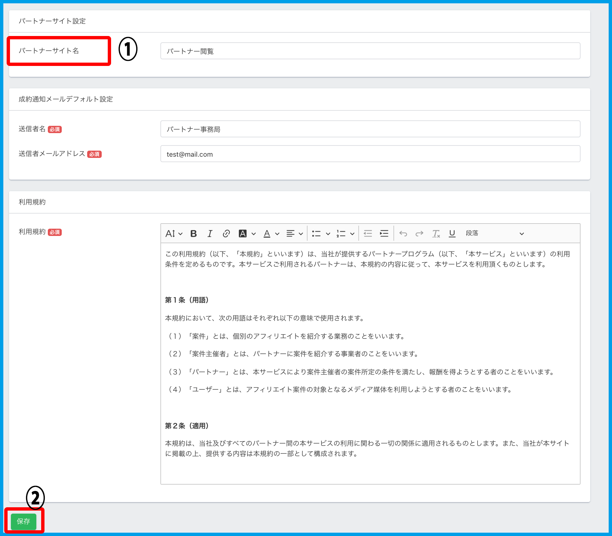 2.【パートナーサイト設定】の「パートナーサイト名」に変更したいサイト名を入力し【保存】をクリックします。