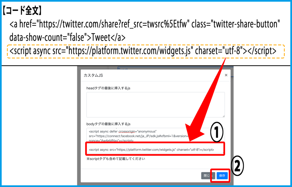5.「<script〜</script>」コードを「bodyタグの最後に挿入するjs」に貼り付け、【保存】をクリックします。