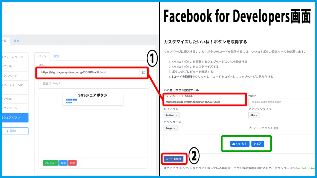 2.ページ内の[カスタマイズしたいいね!ボタンを取得する]でURLを貼り付け【コードを取得】をクリックします。