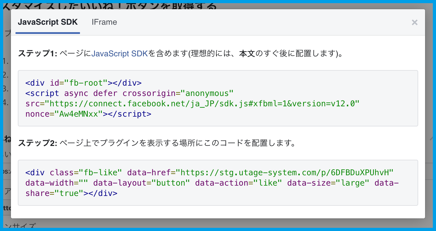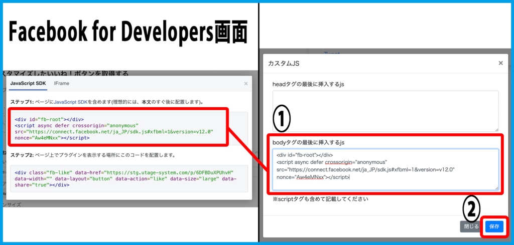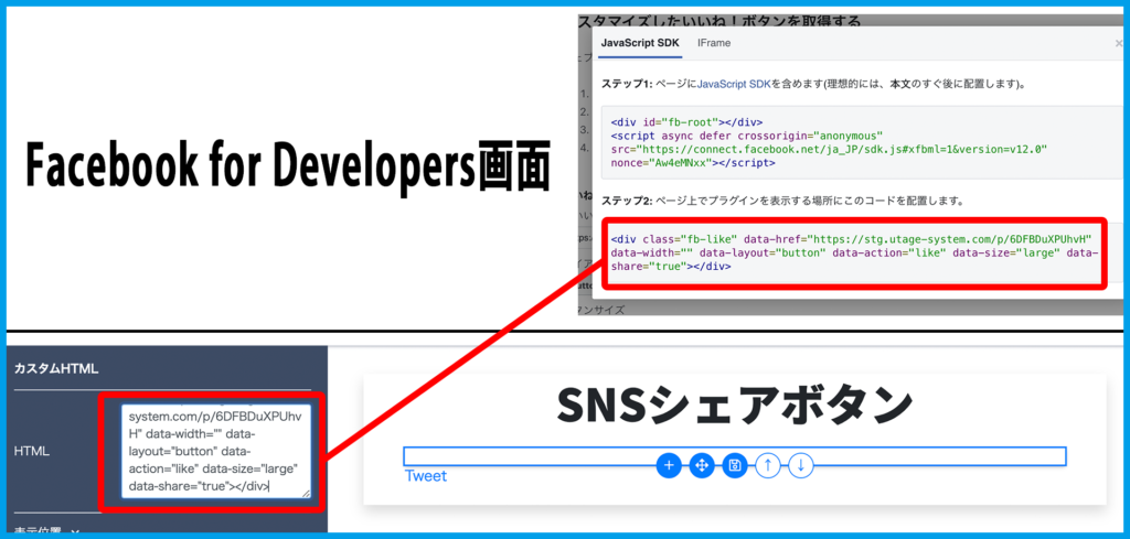 ※今回貼り付けた部分前のコードは、前目次「設置方法(Facebook)」で利用したコードになります。
