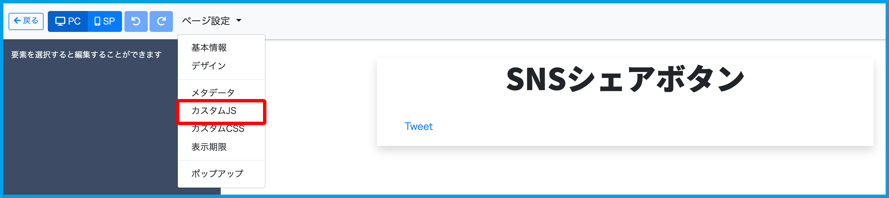 4.ページ編集画面のページ設定>カスタムJSを開きます。