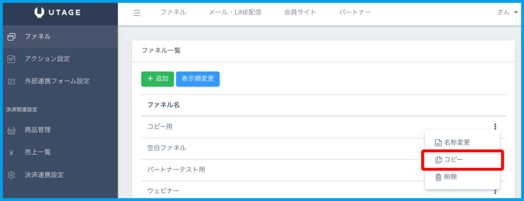 1.コピーしたいファネルの「⋮」をクリックし【コピー】を選択します。