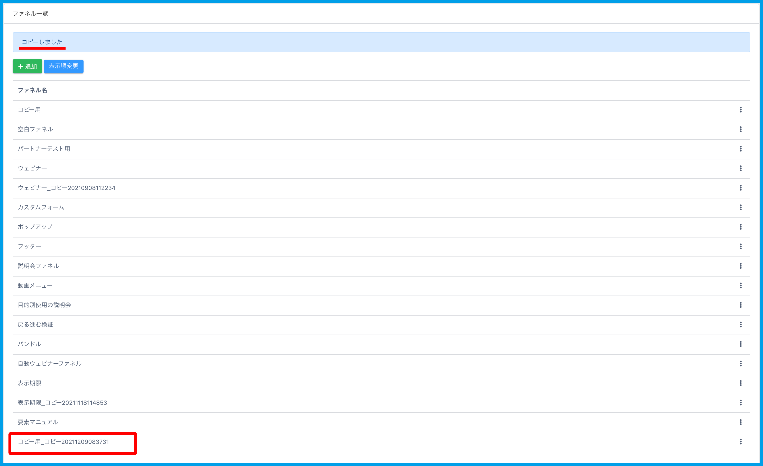 2.メッセージが表示され「ファネル一覧」の一番下にコピーが作成されます。