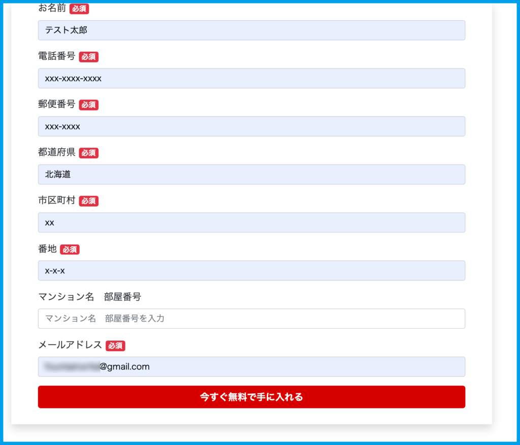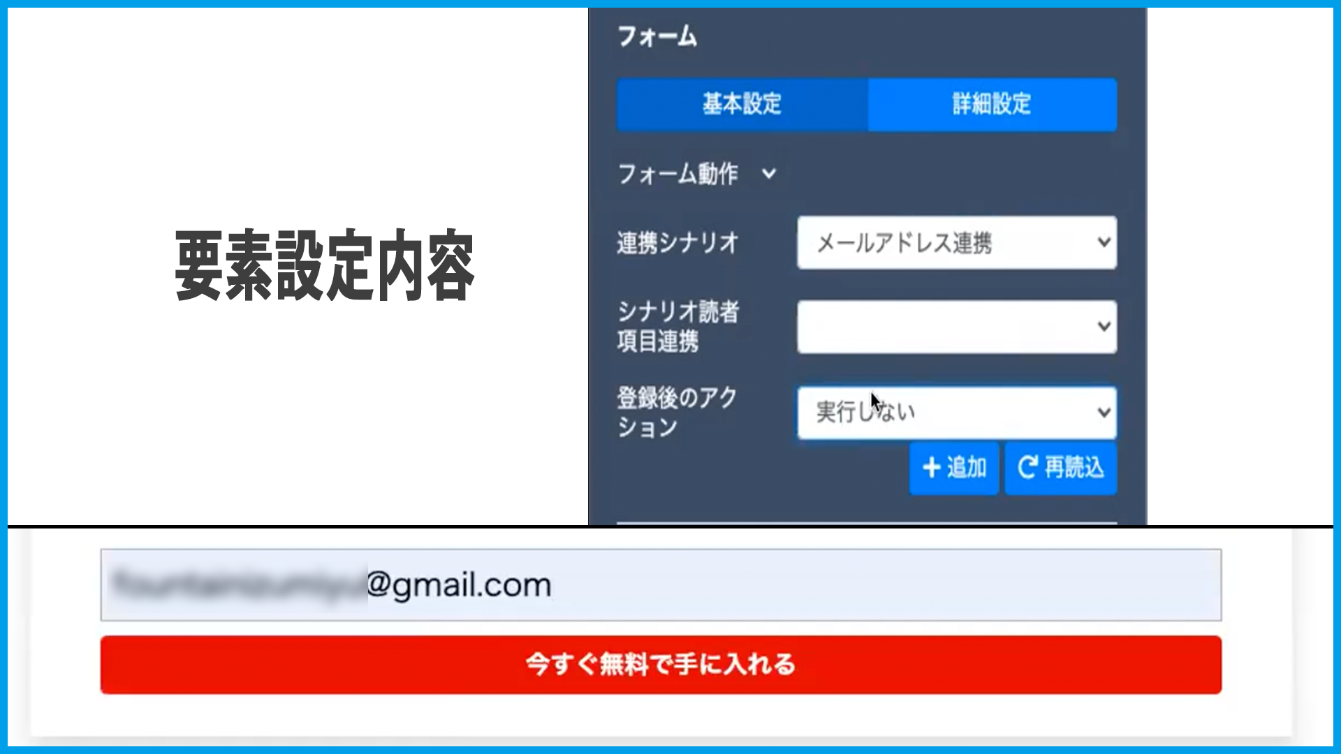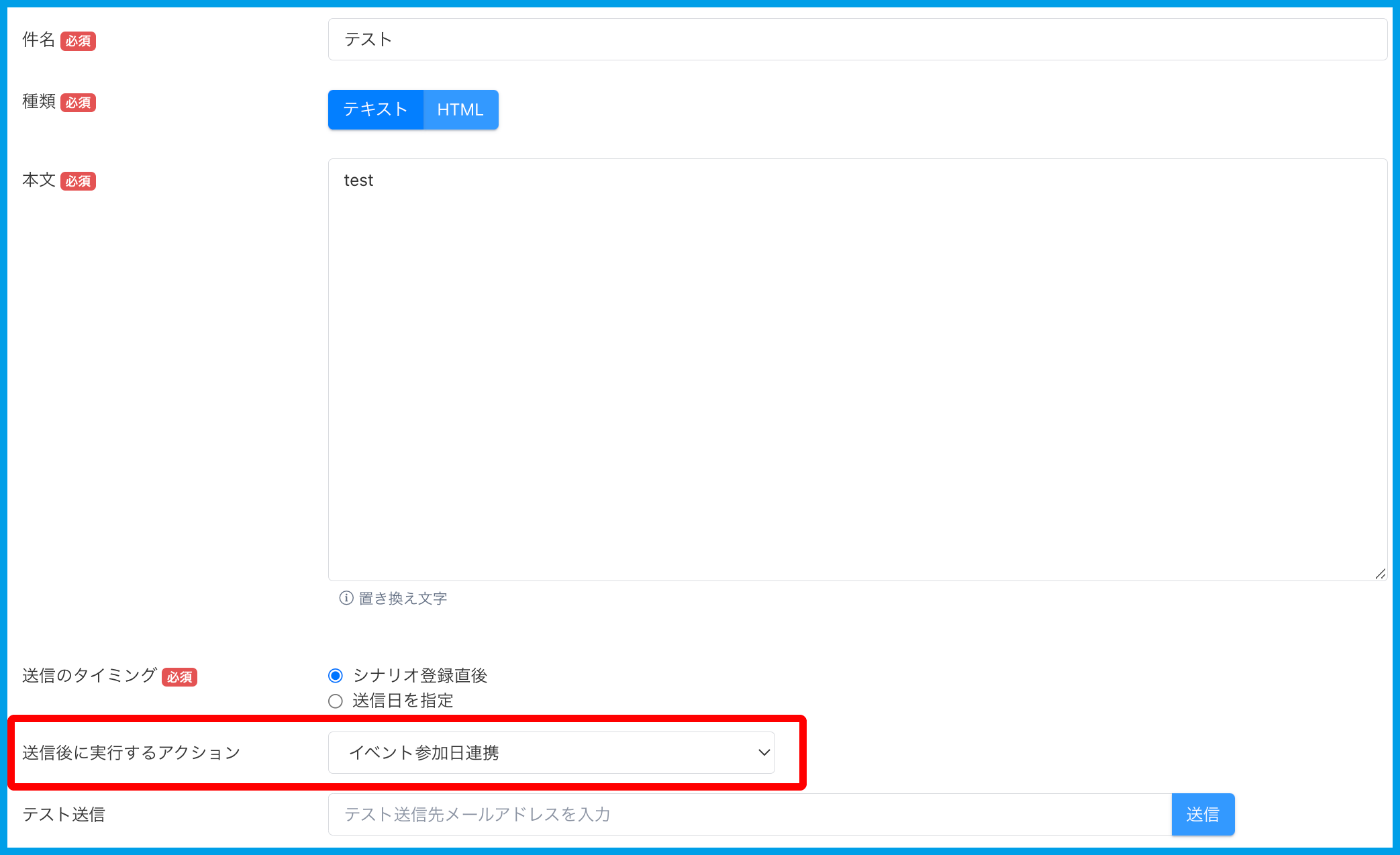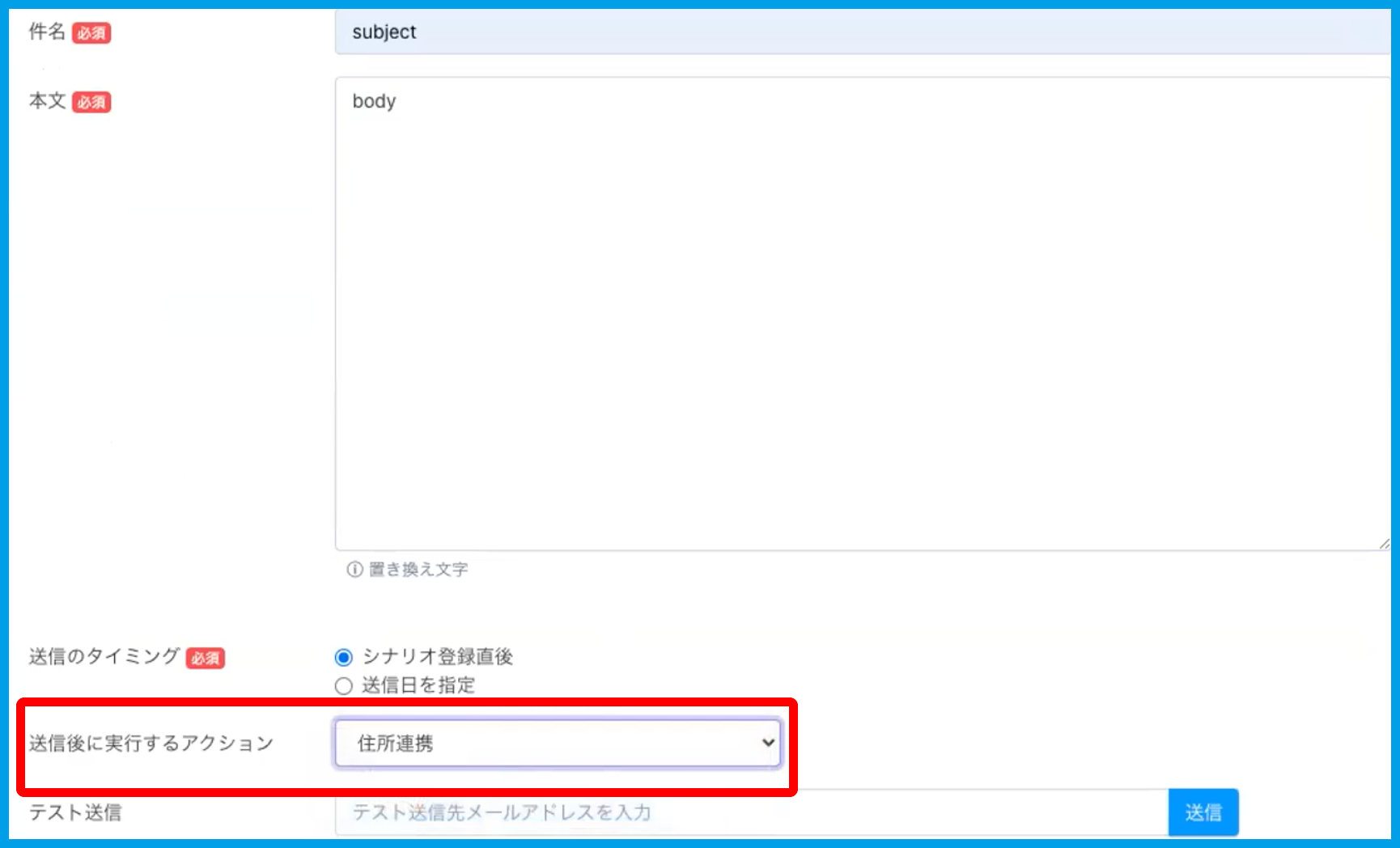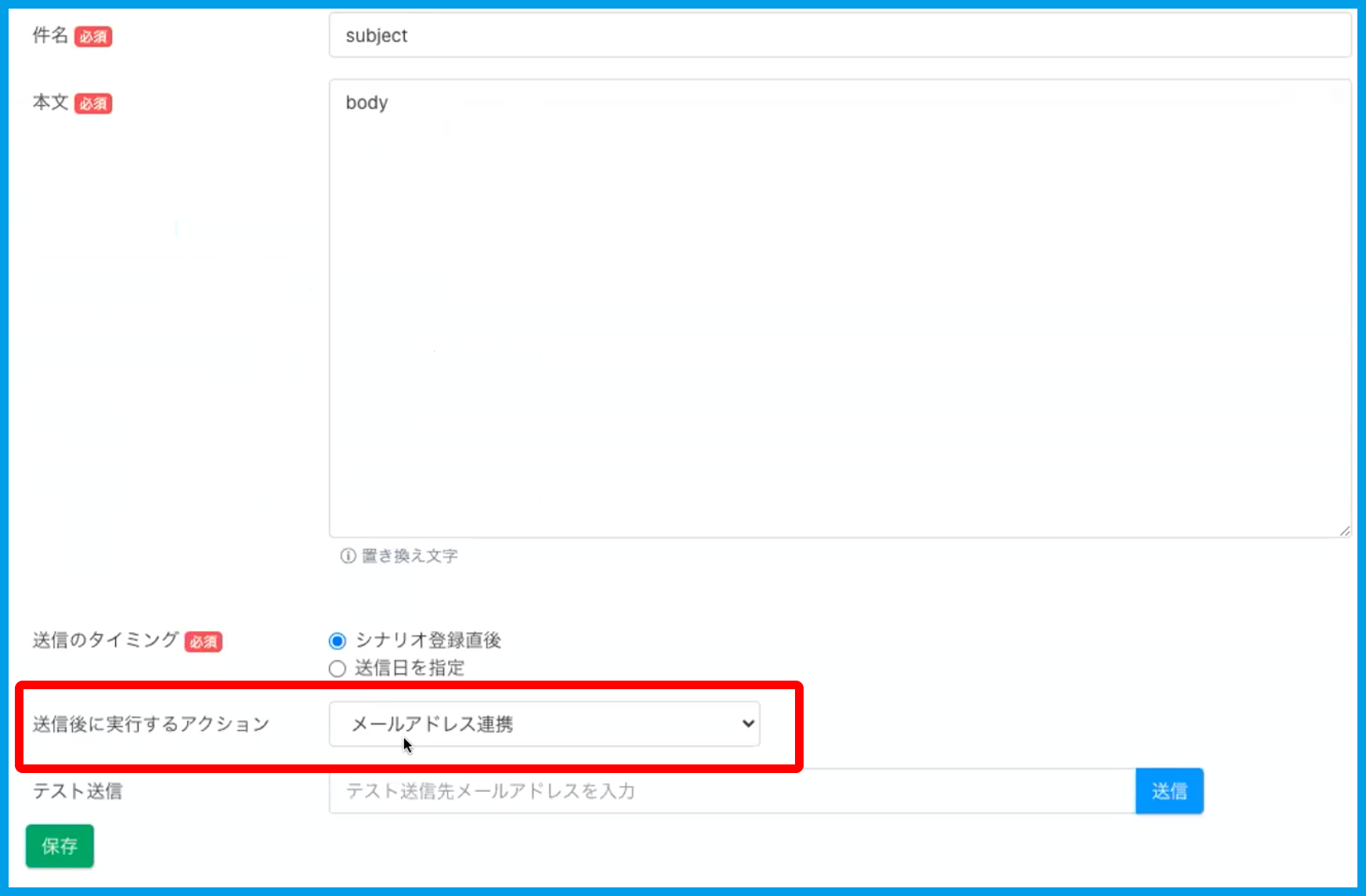 20.登録直後に配信するメールにアクションを設定し、シナリオ連携したページの登録フォームなどからテスト登録します。