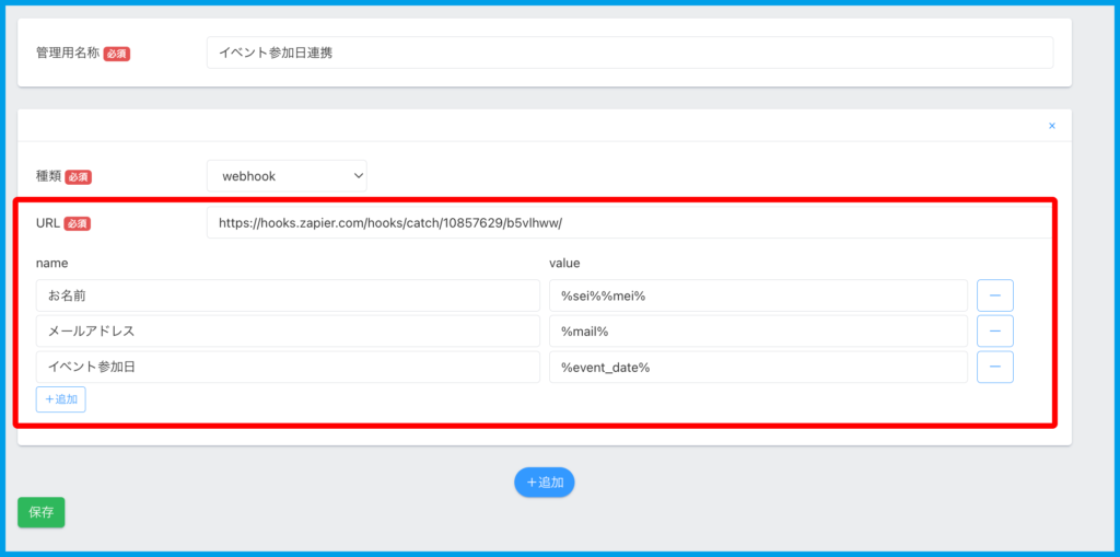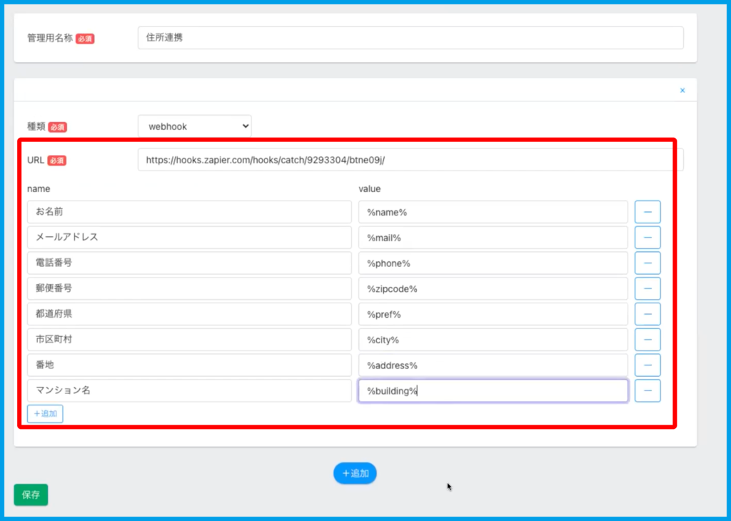 シナリオアクションの「webhook」でzapierの情報を設定し、