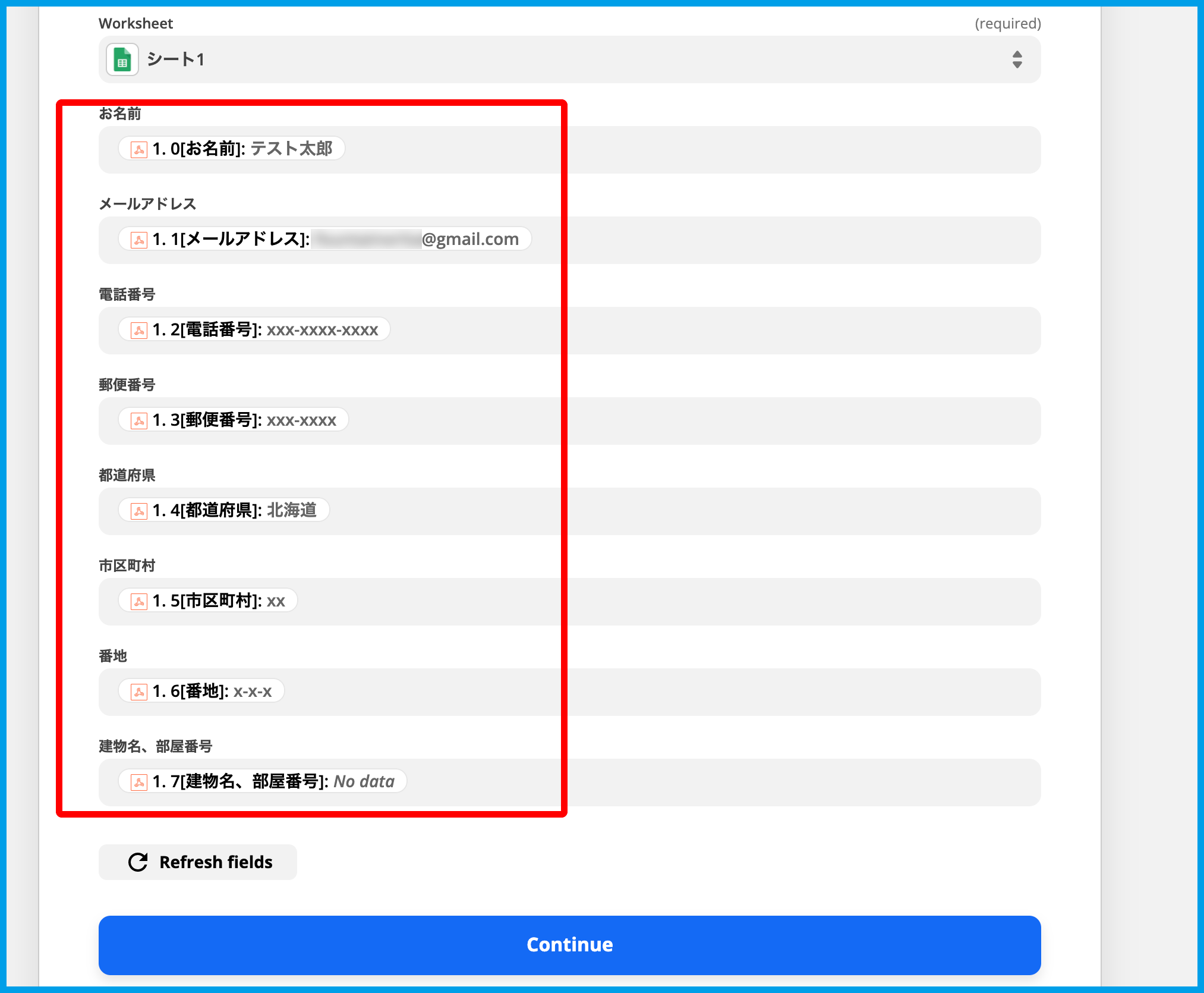 22.成功すると、手順20でテスト登録した内容が表示されますので【Continue】をクリックします。