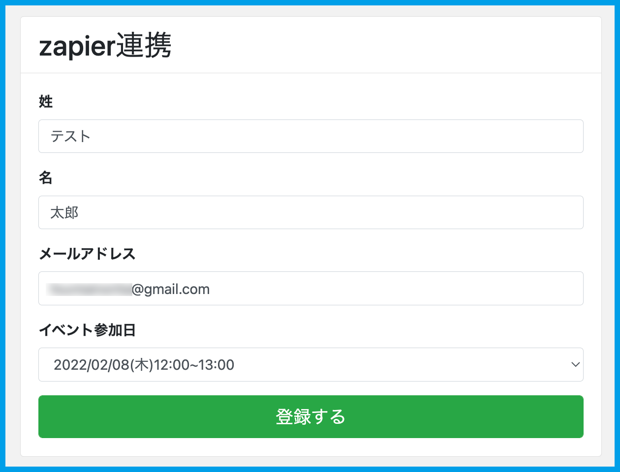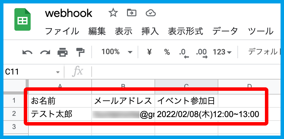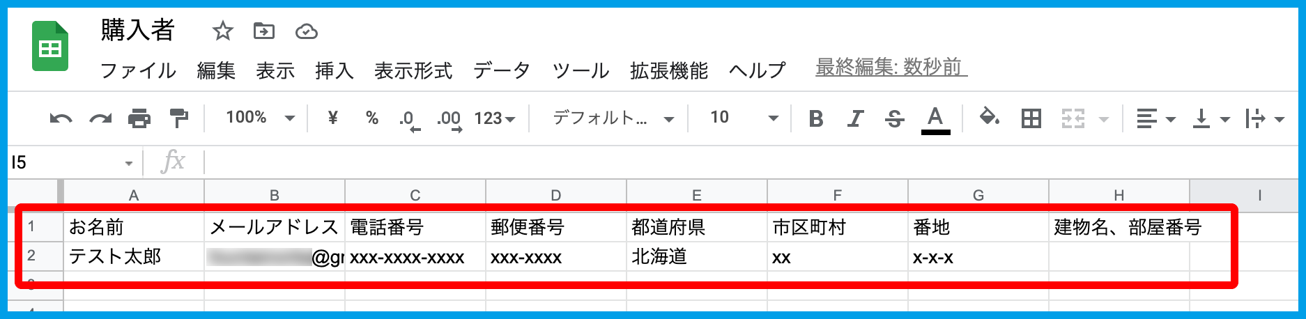 手順7・8のアクションを設定したフォームから登録がされると自動的に取得情報が連携先シートに反映されるようになります。