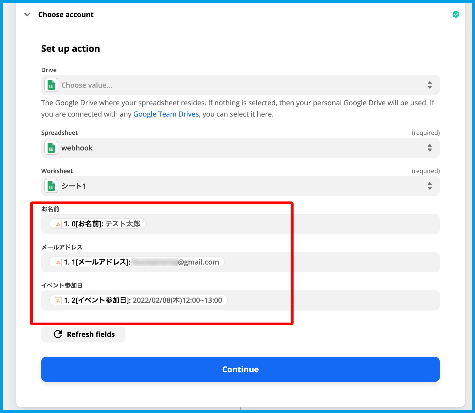 23.「2.Create Spreadsheet Row in Google Sheets」の「Set up action」にて、項目欄で該当のデータを選択します。