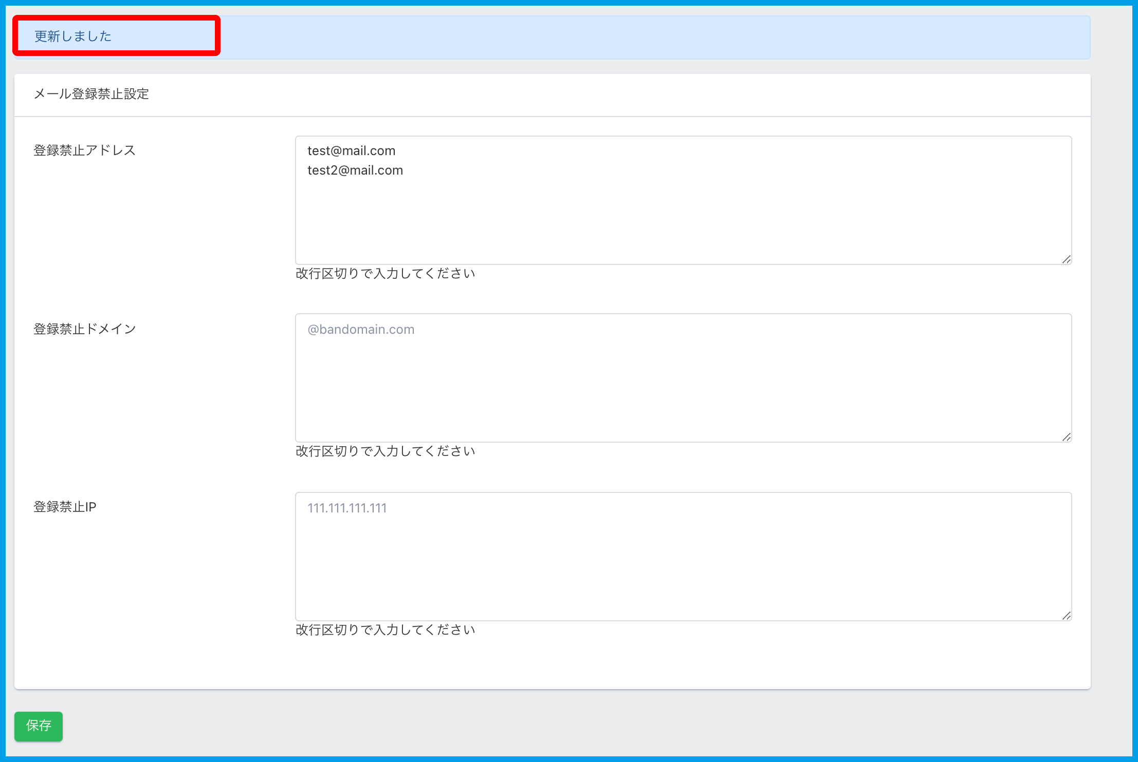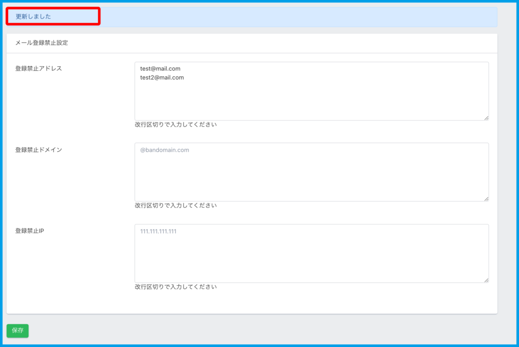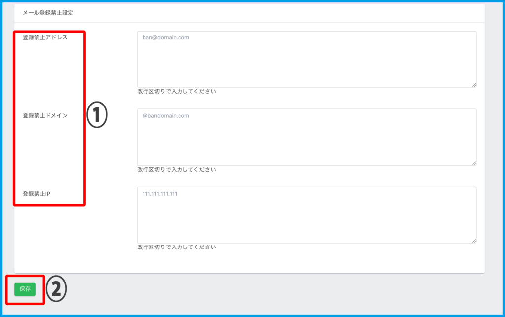 3.登録禁止にしたい「アドレス・ドメイン・IP」に情報入力し【保存】をクリックします。
