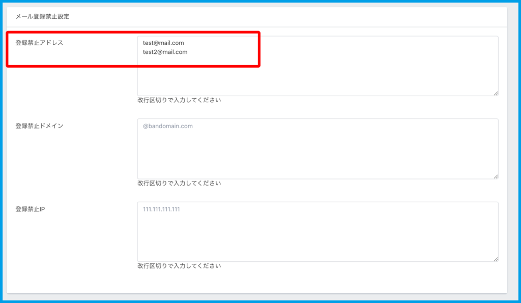 指定したメールアドレス、ドメイン、IPの登録を禁止するための設定となります。
