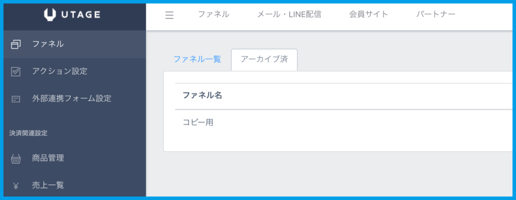 3.「ファネル一覧」の隣にある【アーカイブ済】タブをクリックすると、アーカイブしたファネルを確認することができます。