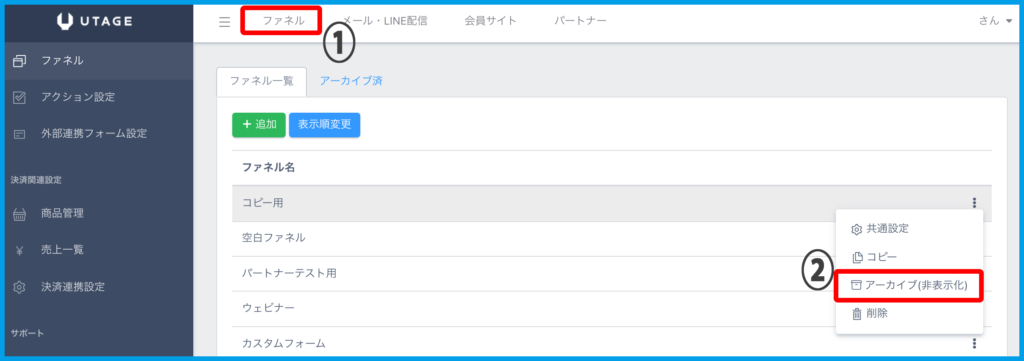 1.上メニュー【ファネル】>アーカイブしたいファネルの「⋮」メニューより【アーカイブ(非表示化)】をクリックします。