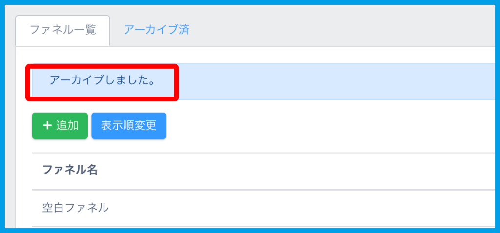 2.メッセージが表示され、アーカイブ解除したファネルが「ファネル一覧」に表示されるようになります。