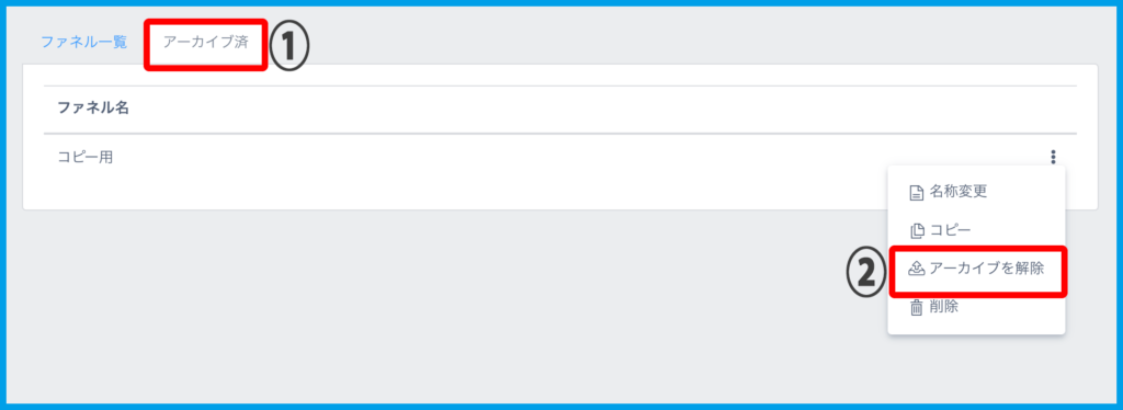 1.「アーカイブ済」一覧から解除したいファネルの「⋮」メニューより【アーカイブを解除】をクリックします。