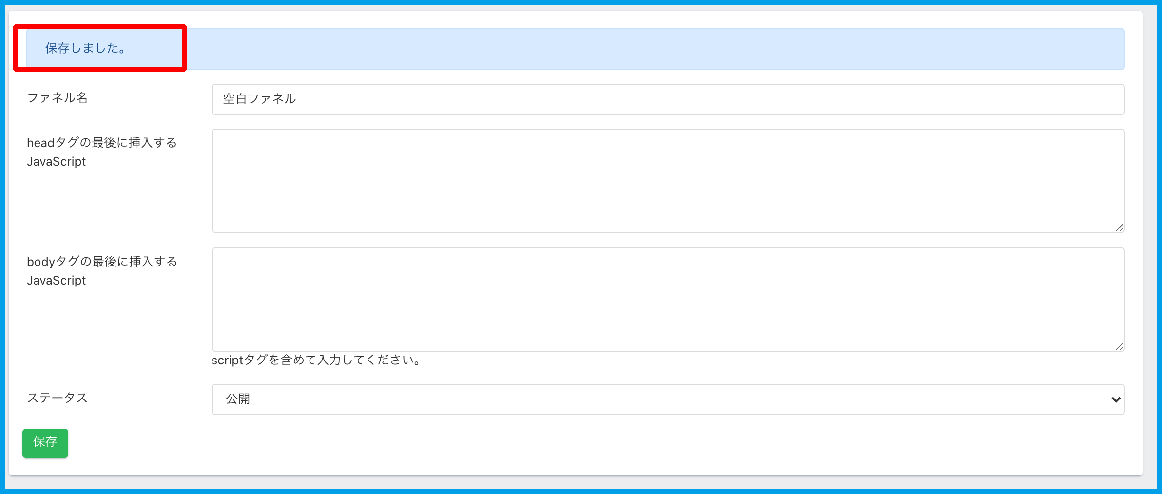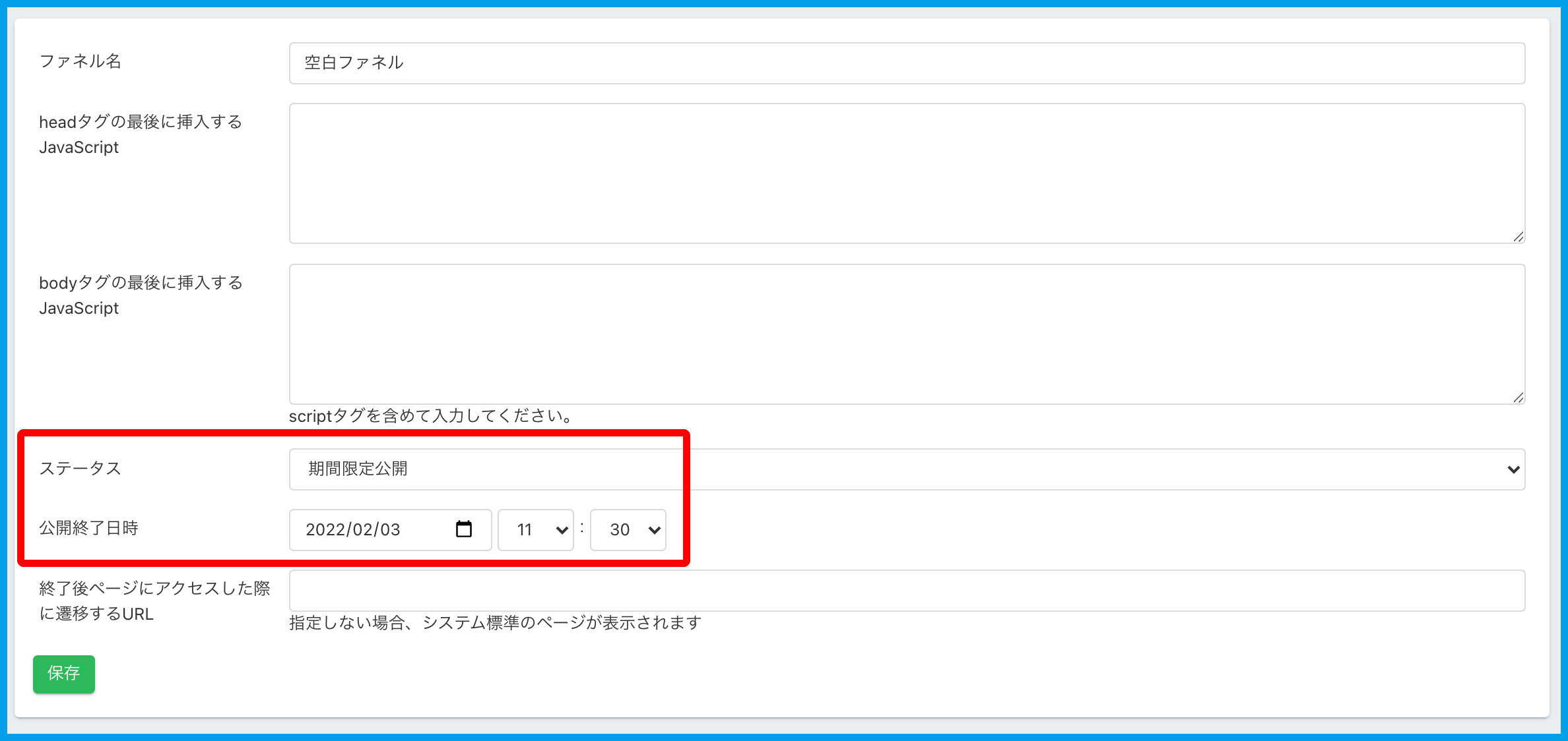 ファネル名の変更を始め、JavaScriptの設定、公開ステータスにて、公開/非公開のみでなく、表示期限の設定をすることができます。
