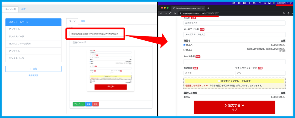 テストモードを設定しているファネルは一覧でわかるように「テスト決済モード」と赤字で表示されます。