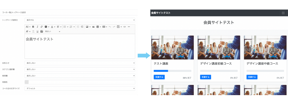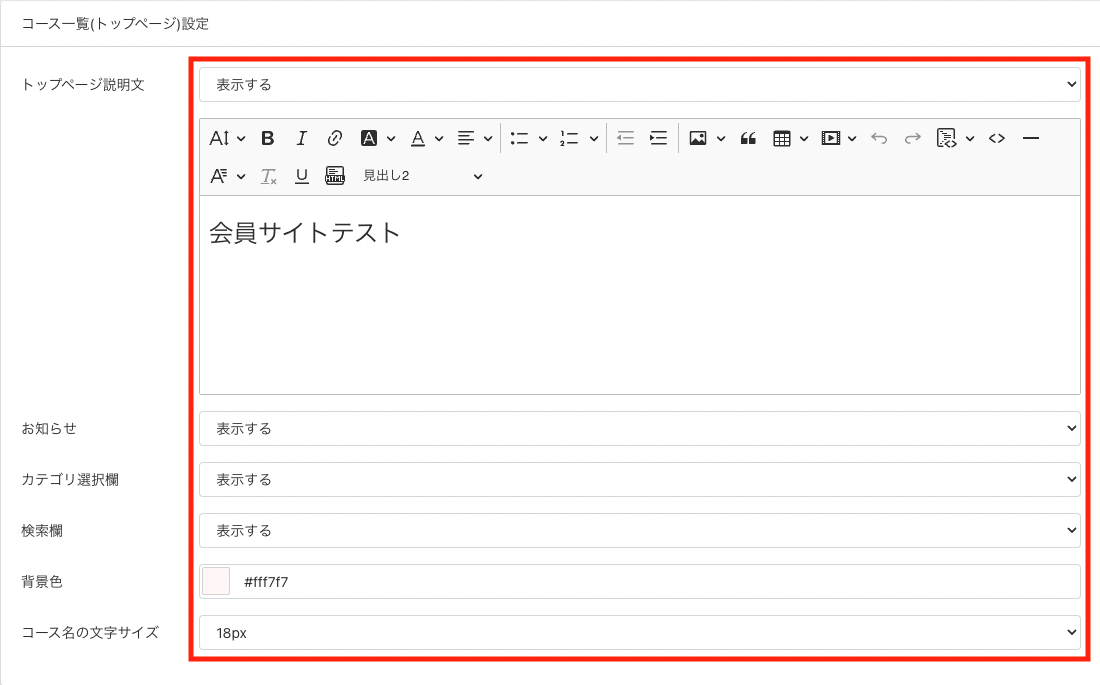 ・トップページ説明文:「表示する」「表示しない」よりお選びいただけます。トップページに表示されるテキストの編集ができます。