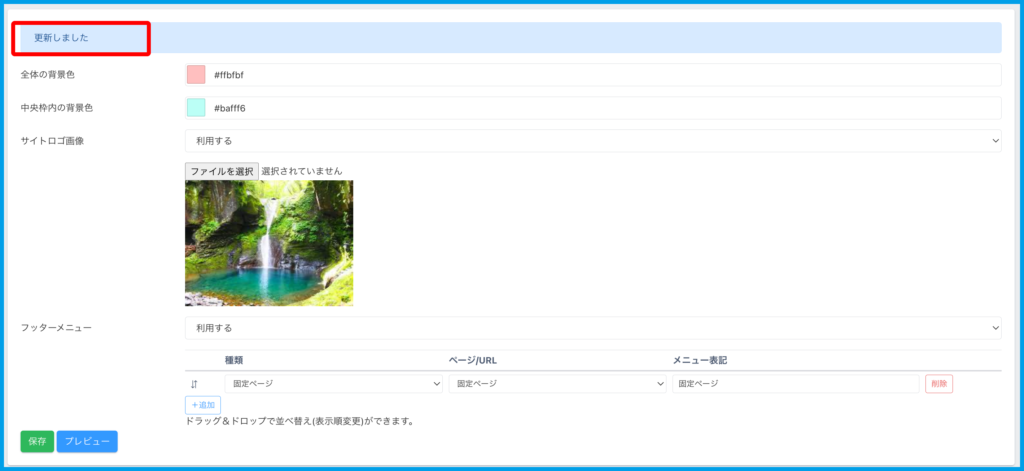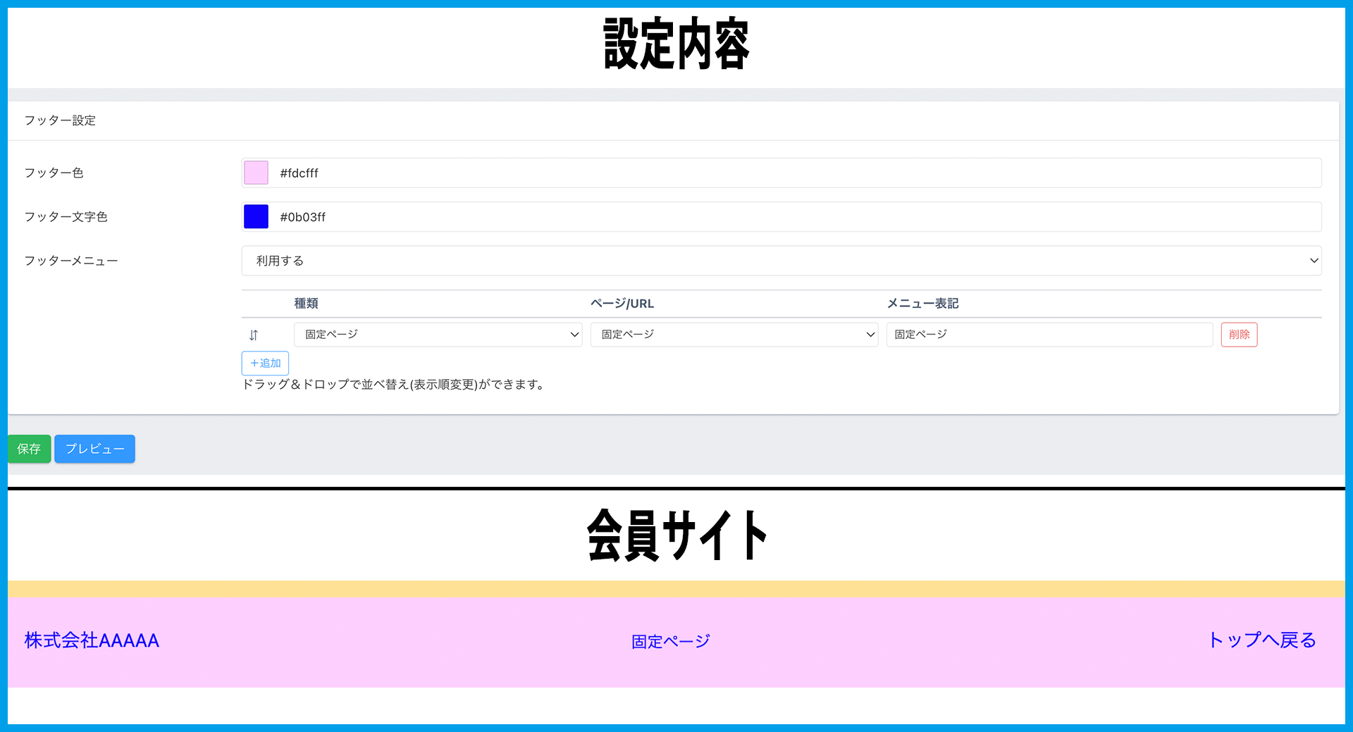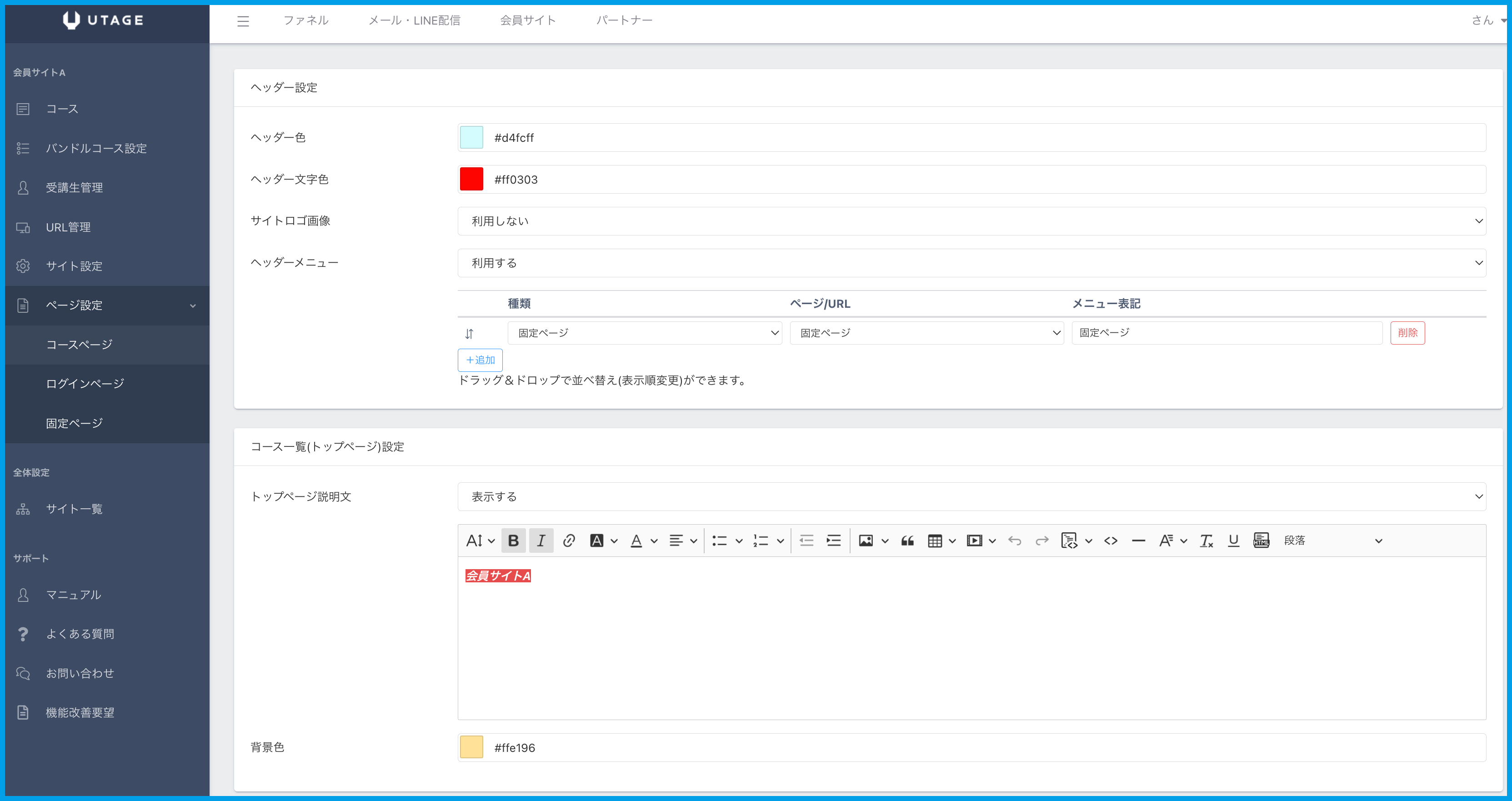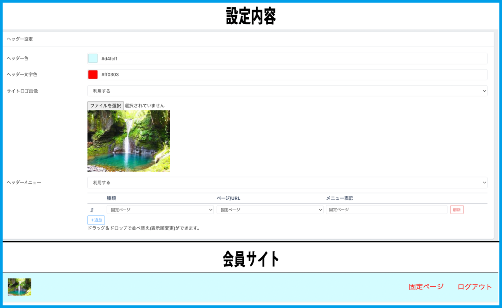 フッダー/ヘッダーメニューの編集、会員サイトのロゴ画像の設定も可能です。