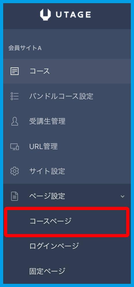 2.左メニュー「ページ設定」より【コースページ】をクリックします。