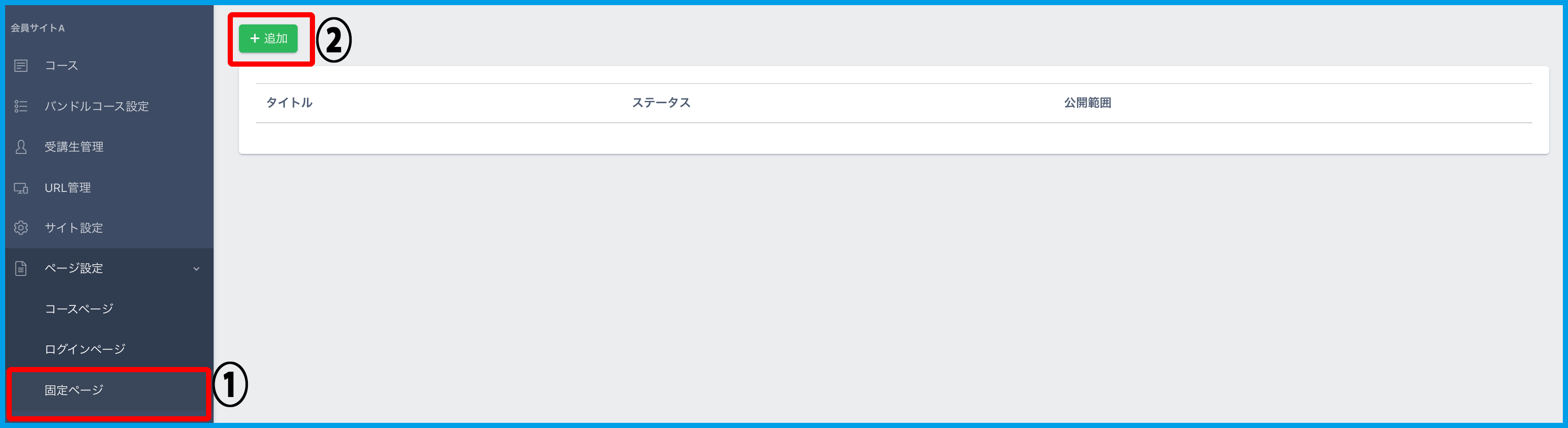 1.左メニュー「ページ設定」より【固定ページ】を選択し+追加をクリックします。