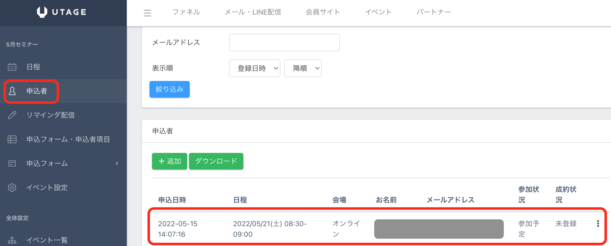 登録フォームから申し込んだ申込者の一覧を確認できます。