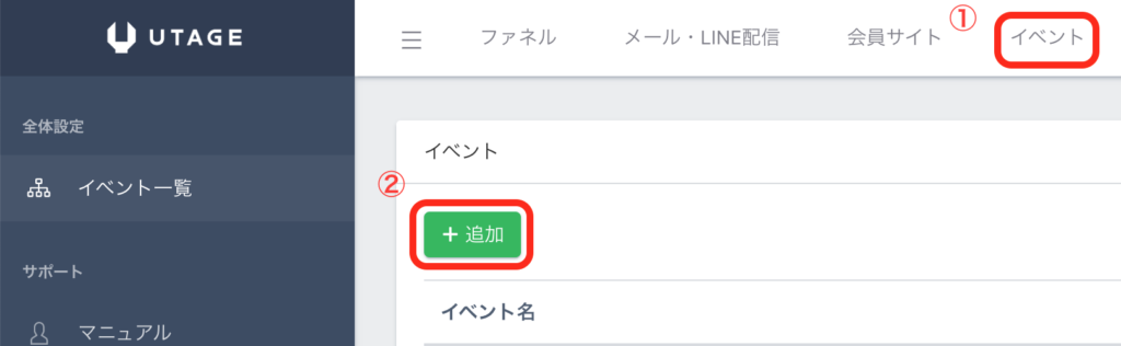 1.上メニュー【イベント】を選択し「イベント」の【+追加】をクリックします。