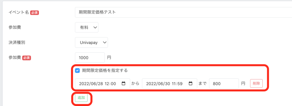 有料開催の場合、「期間限定価格を設定する」を選択することができます。