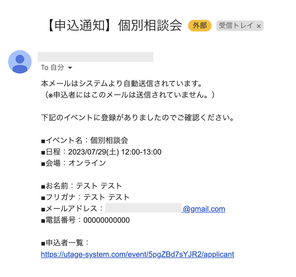 イベント設定>【メール通知設定】より、イベントに申し込みが入った際のメール通知を設定することができます。