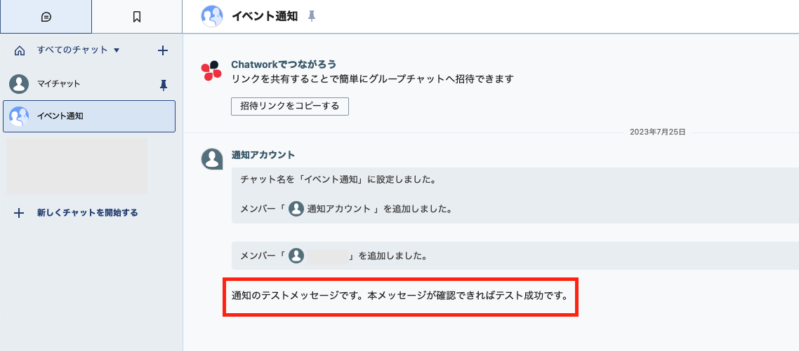 ※上記手順で作成したグループチャットに通知が来ていることを確認してください。