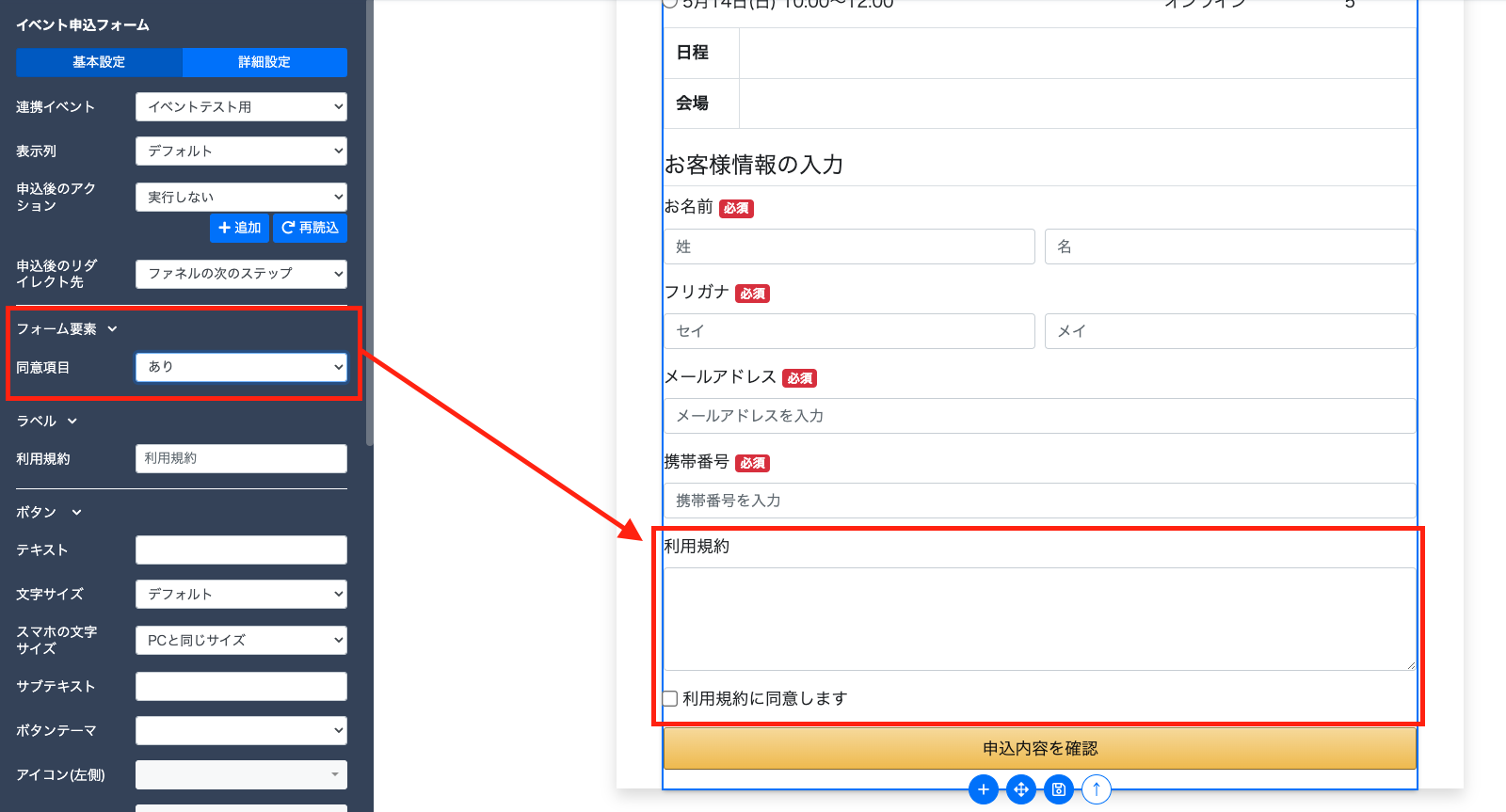 「あり」「なし」より選択できます。「あり」を選択した場合は、『利用規約入力欄』と『利用規約に同意します』が表示されます。