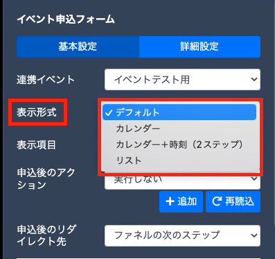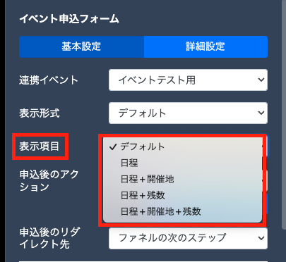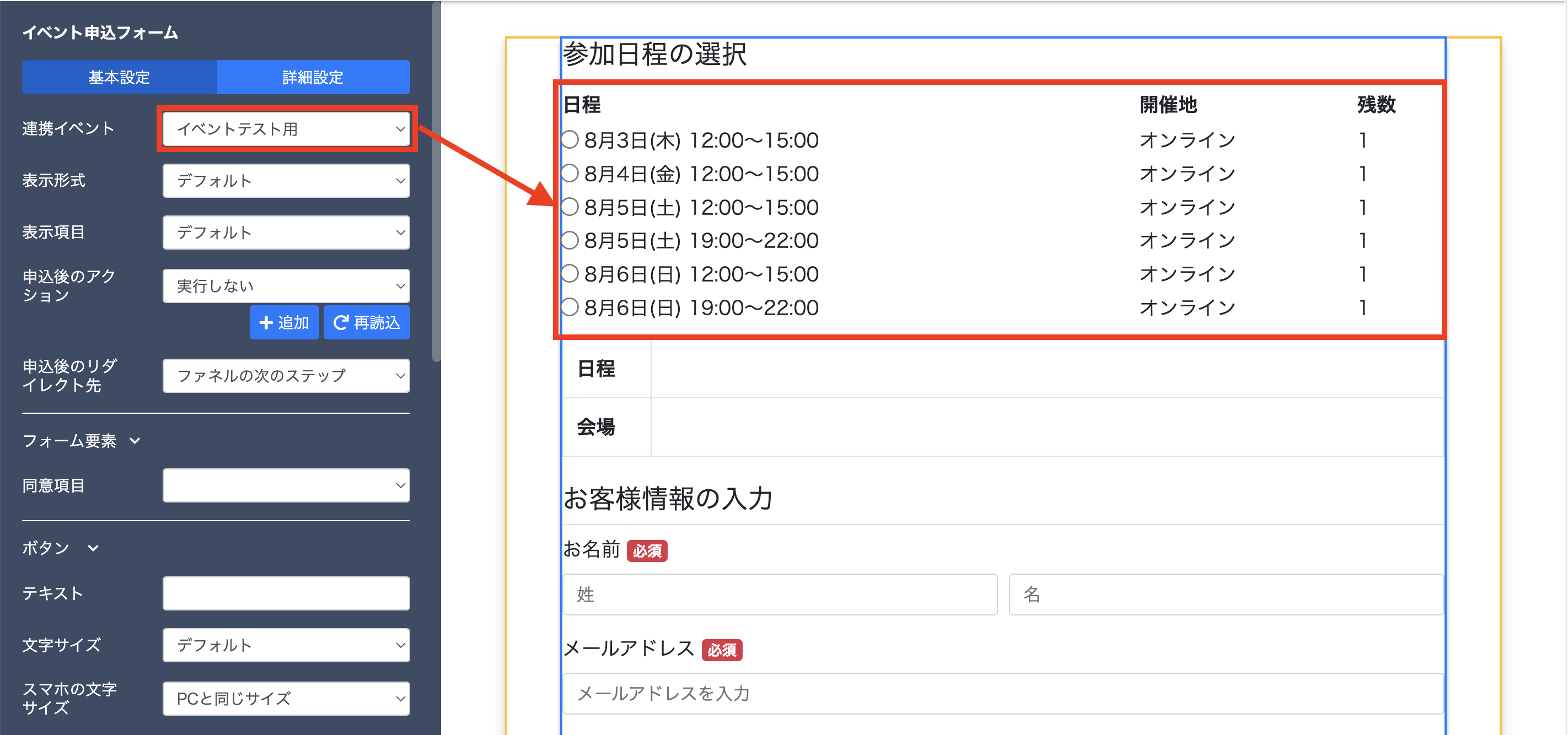 【連携イベント】より事前に作成済みのイベントを選択します。イベント設定で追加済みの日程情報がページに表示されます。