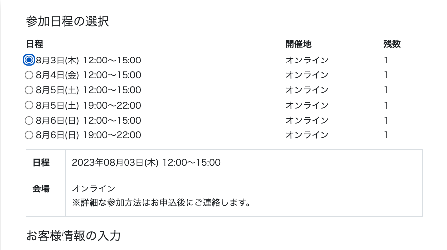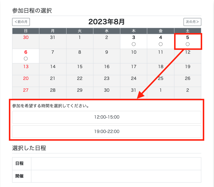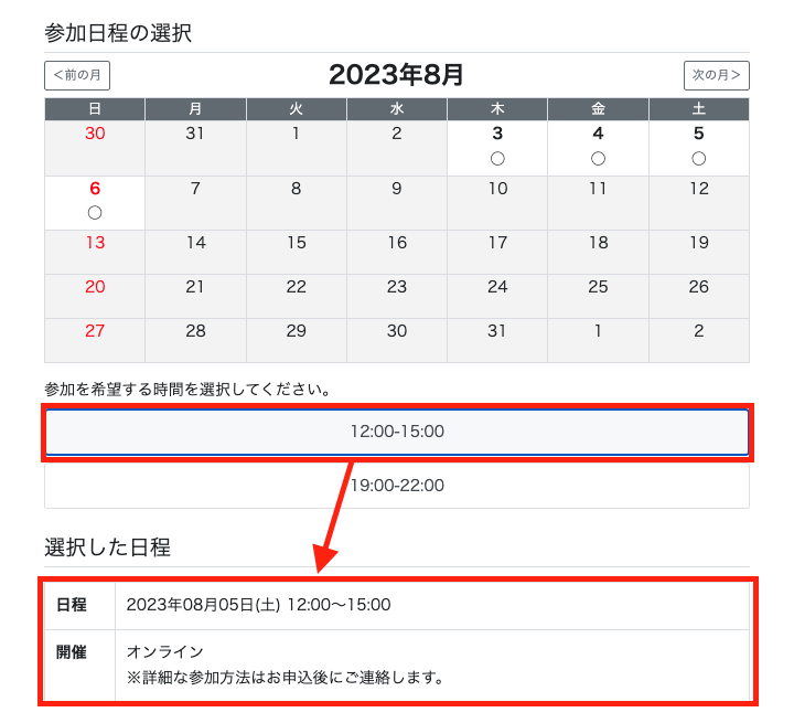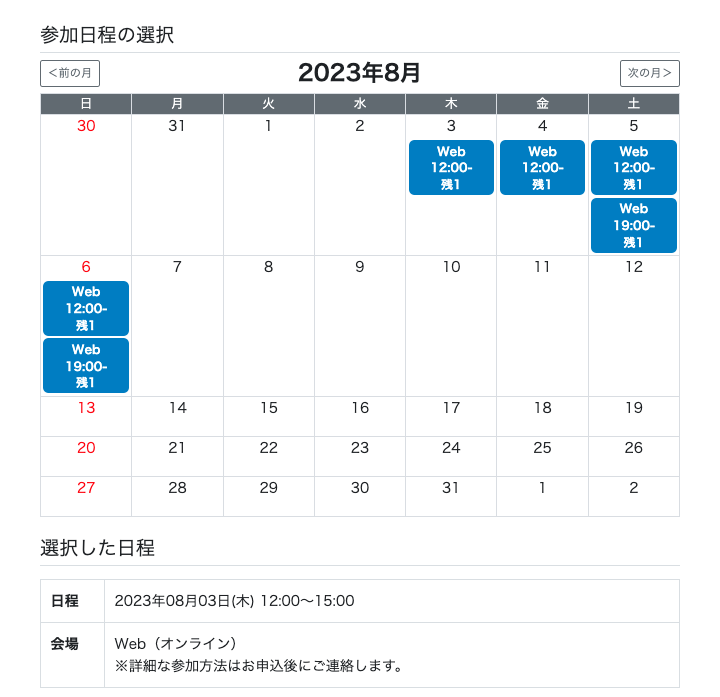 ↓カレンダー+時刻(2ステップ):カレンダーで参加日を選択すると開催時刻が表示されます。