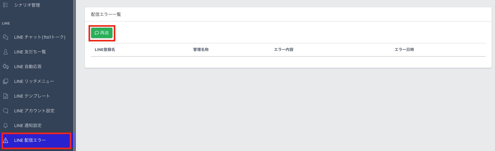また、エラーとなった配信は【再送】ボタンから再送することが可能です。